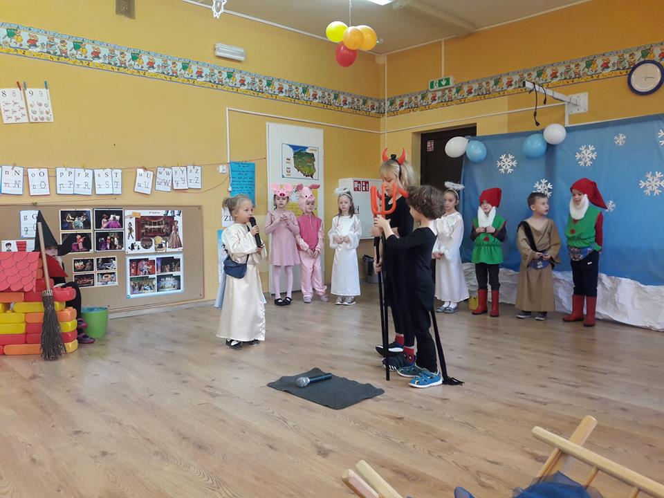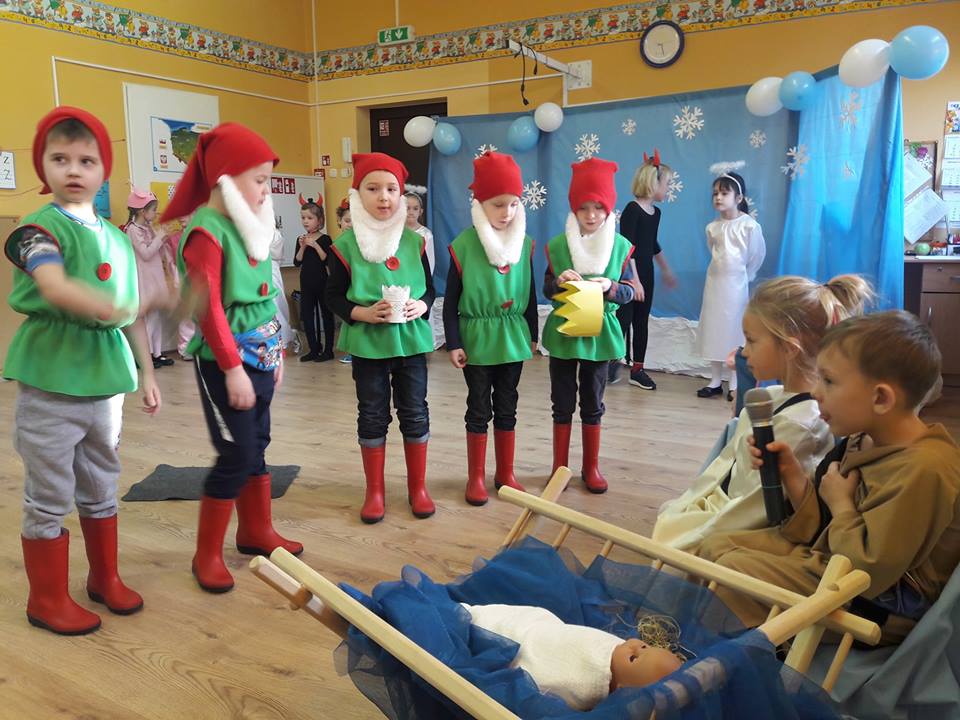 W dniu dzisiejszym, grupę V odwiedziły Dzieci ze Szkoły Podstawowej nr 5 im. Mieszka I w Ostrowie Wielkopolskim. Dla naszych miłych Gości wystąpiliśmy w przedstawieniu „Co się stało z Jasełkami?”.