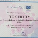 Dzieci z grupy III wzięły udział w wyzwaniu Cała Polska Programuje oraz Europejskim Tygodniu Kodowania – Code Week. Przez dwa tygodnie wykonywaliśmy zadania związane z kodowaniem, z których relacje dały nam wymarzoną główną nagrodę – GENIBOTA.