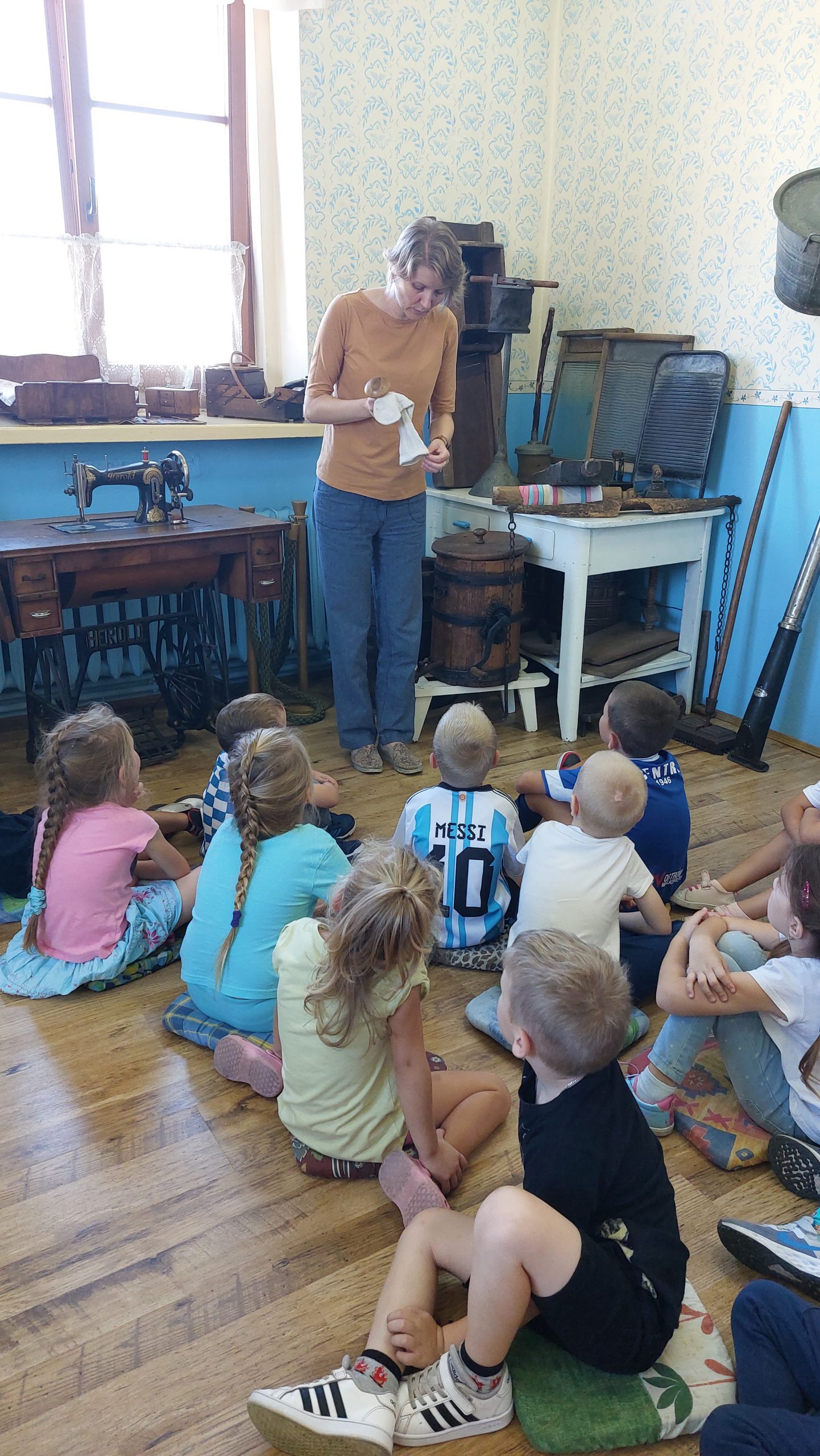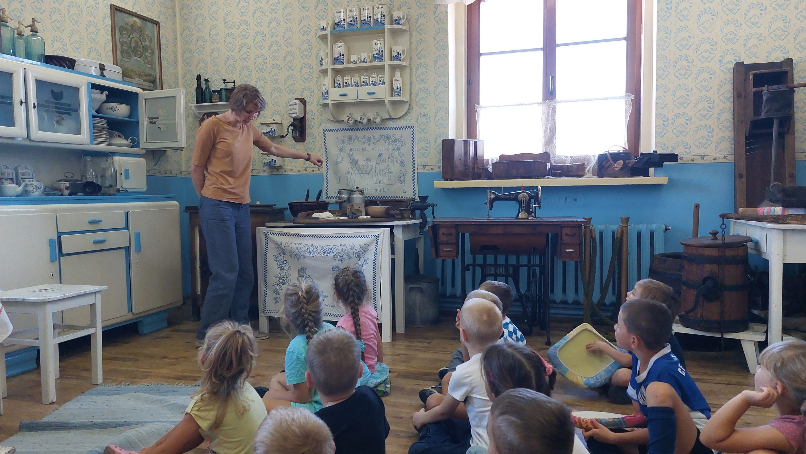 Przedszkolaki miały okazję odwiedzić wystawę „W kuchni Babuni”. Pani zadawała im pytania do czego służą różne przedmioty znajdujące się w kuchence babuni. Dzieci miały krótką lekcję gwary wielkopolskiej – poznały m.in nazwy ryczka, fyrlejka, szneka z glancem.