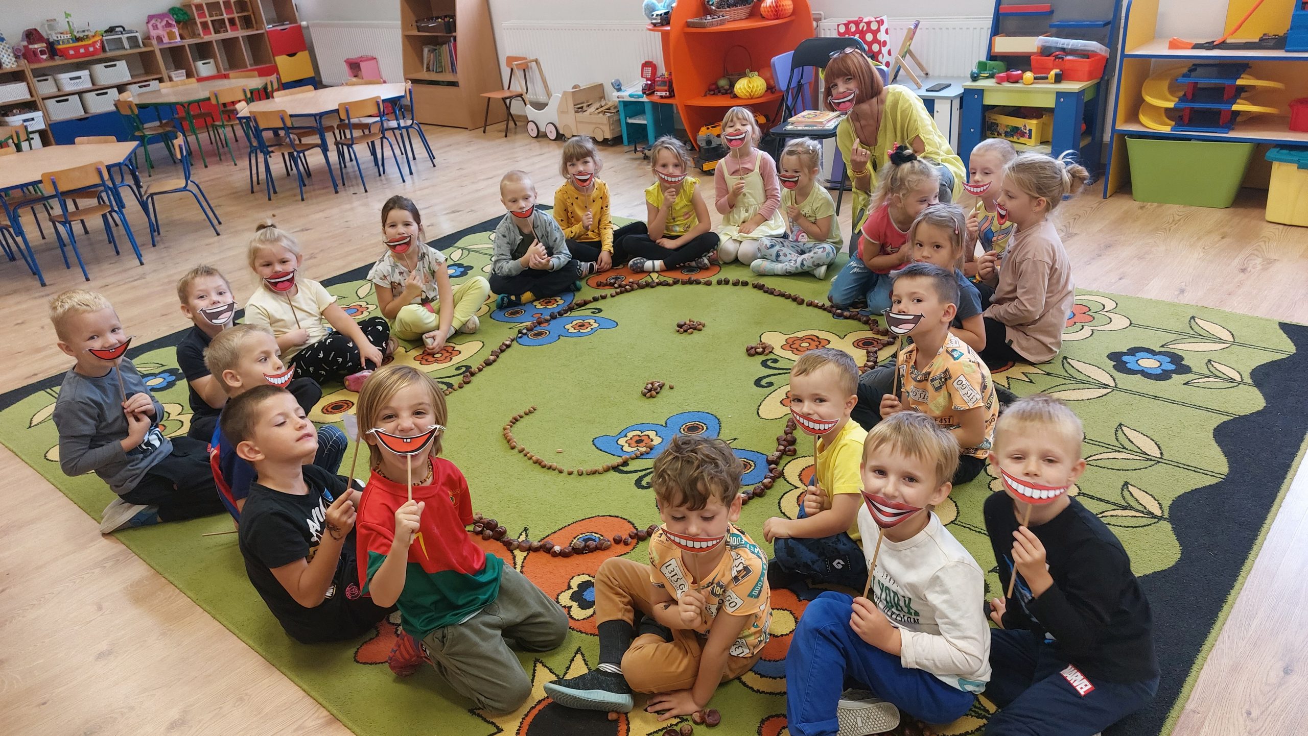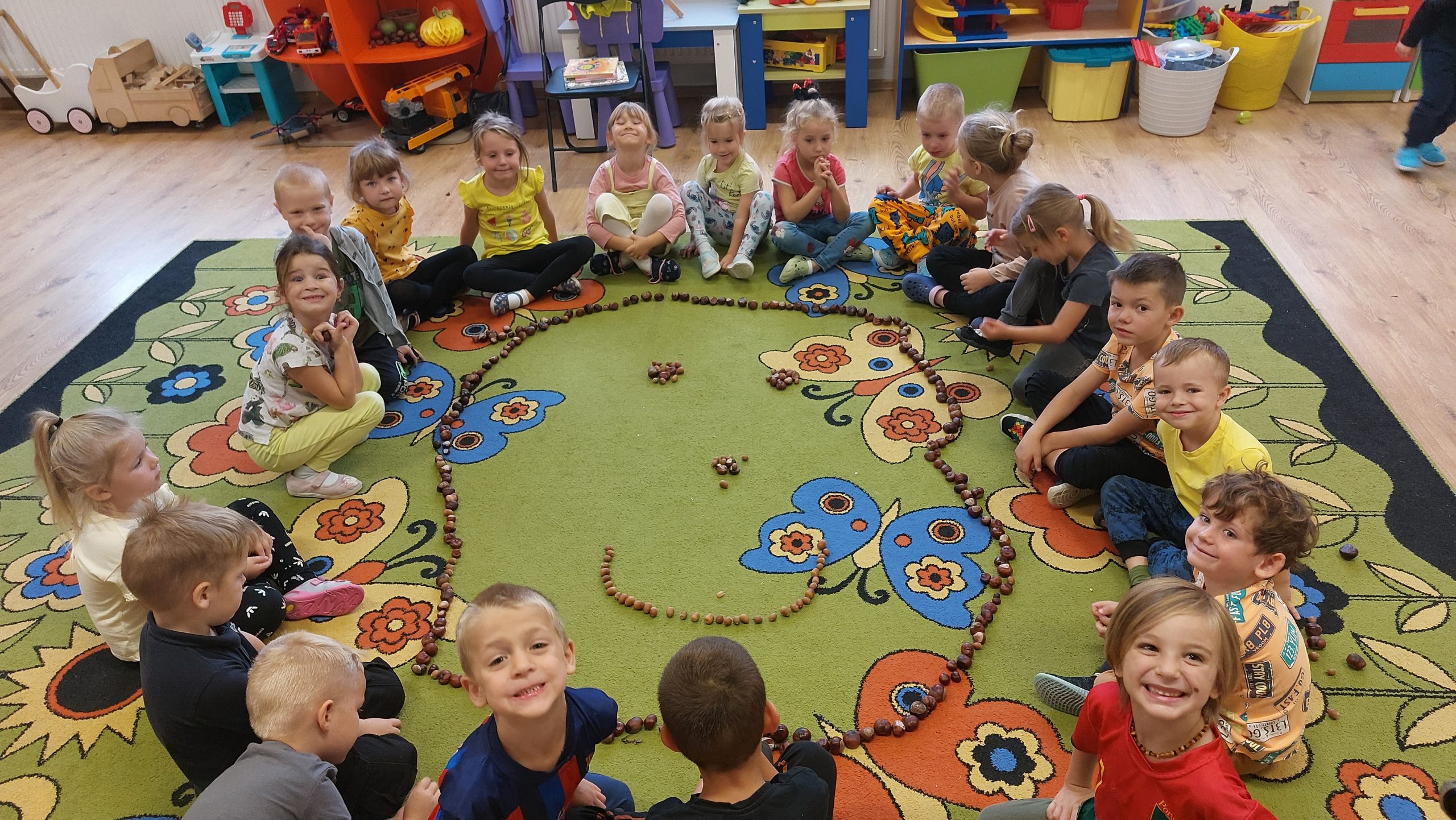 Pani Małgosia przeczytała dzieciom książkę „Proszę mnie przytulić”. Następnie dzieci przy użyciu kasztanów i żołędzi ułożyły uśmiechnięte buzie na dywanie.