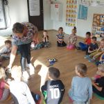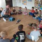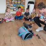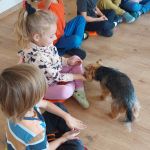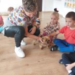 W tym dniu na naszych zajęciach pojawiła się Pani Amanda z psem. Pani Amanda jest dogoterapeutą i przeprowadziła z dziećmi zajęcia z pieskiem.
