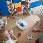W drugiej części zajęć dzieci wykonywały woreczki sensoryczne z uszytych kawałków materiałów. Do woreczków wsypywały groch i kaszę. Woreczki dzieci wzięły ze soba do domu jako pamiątkę z dzisiejszego dnia.
