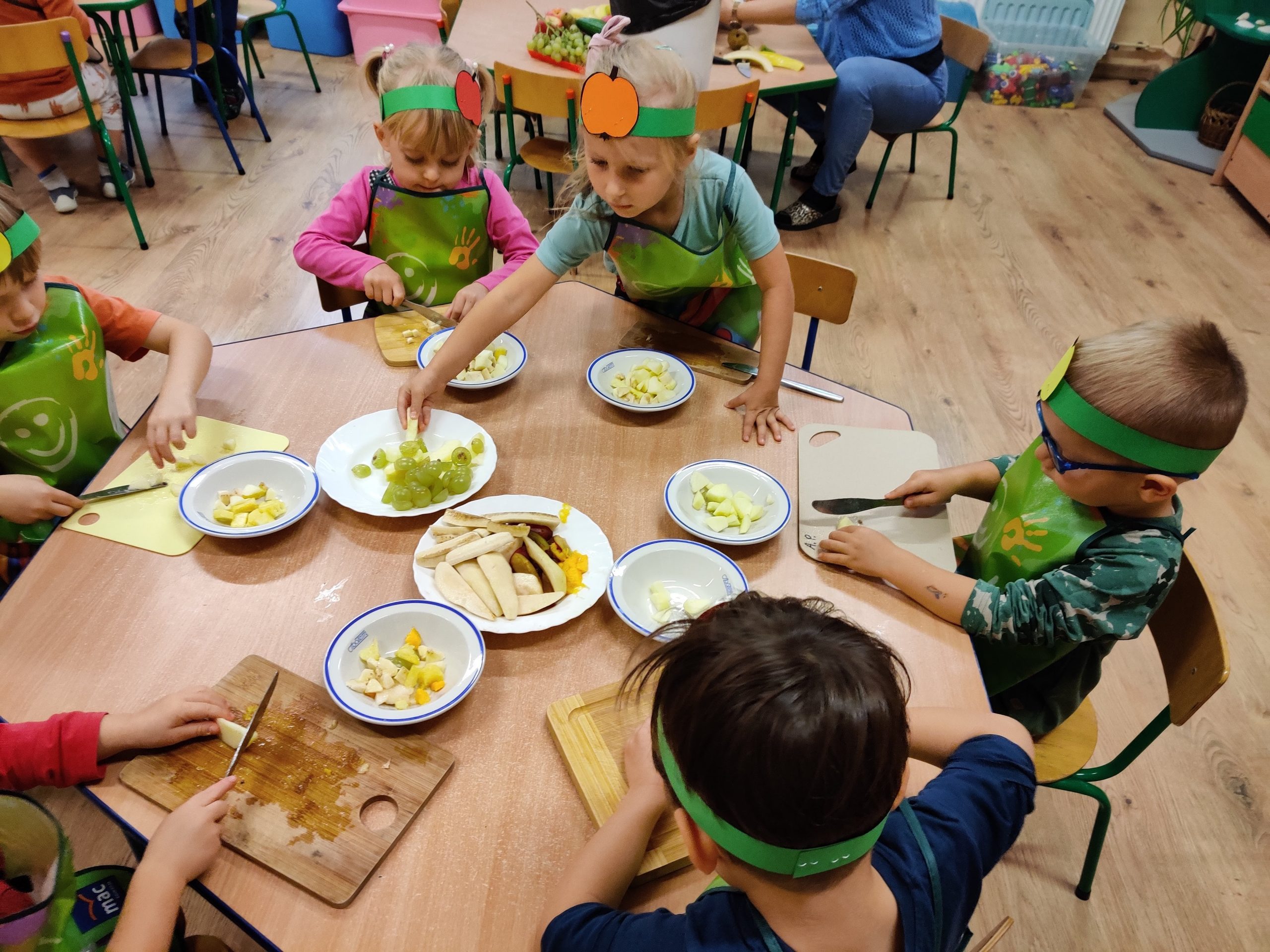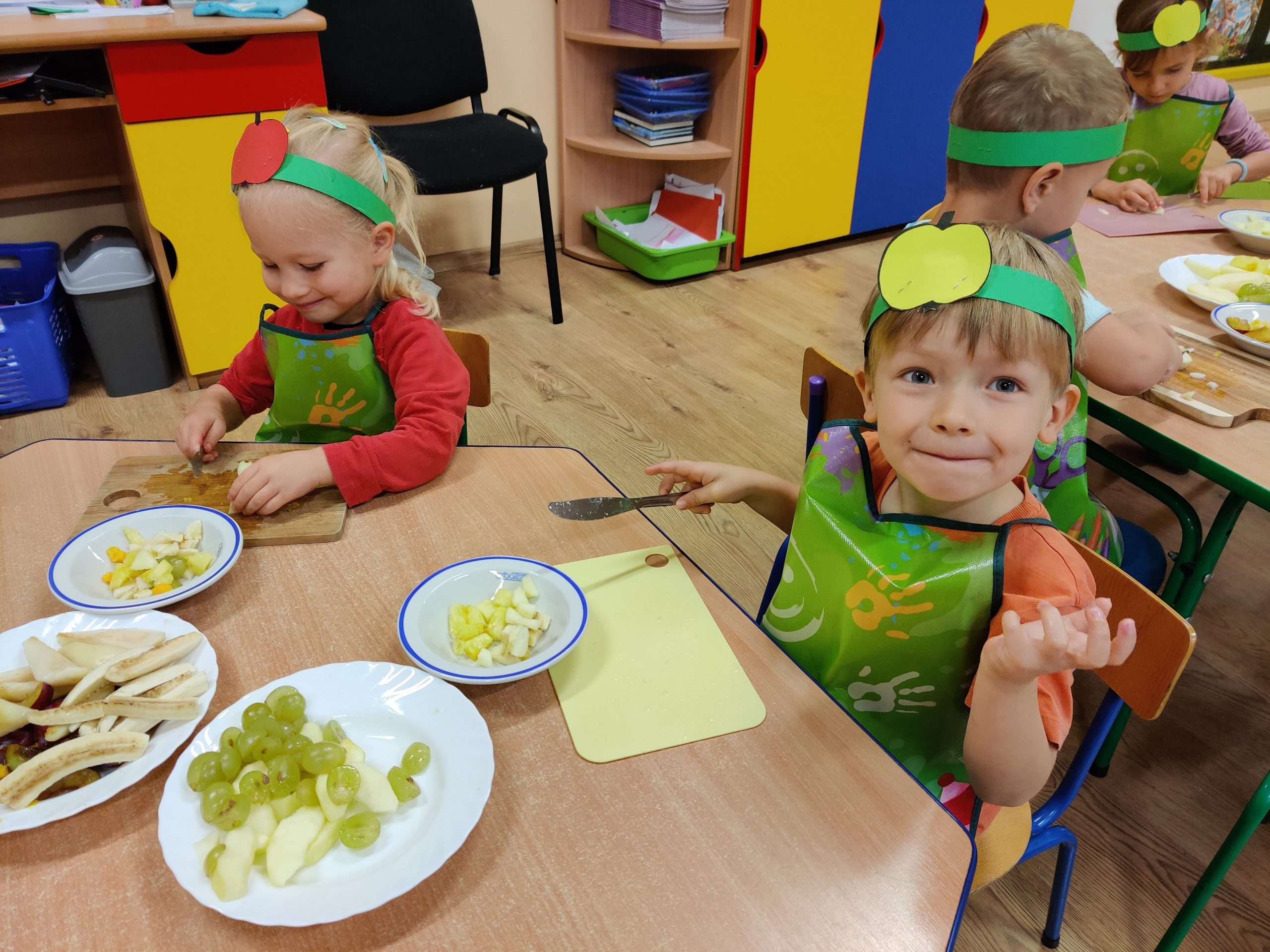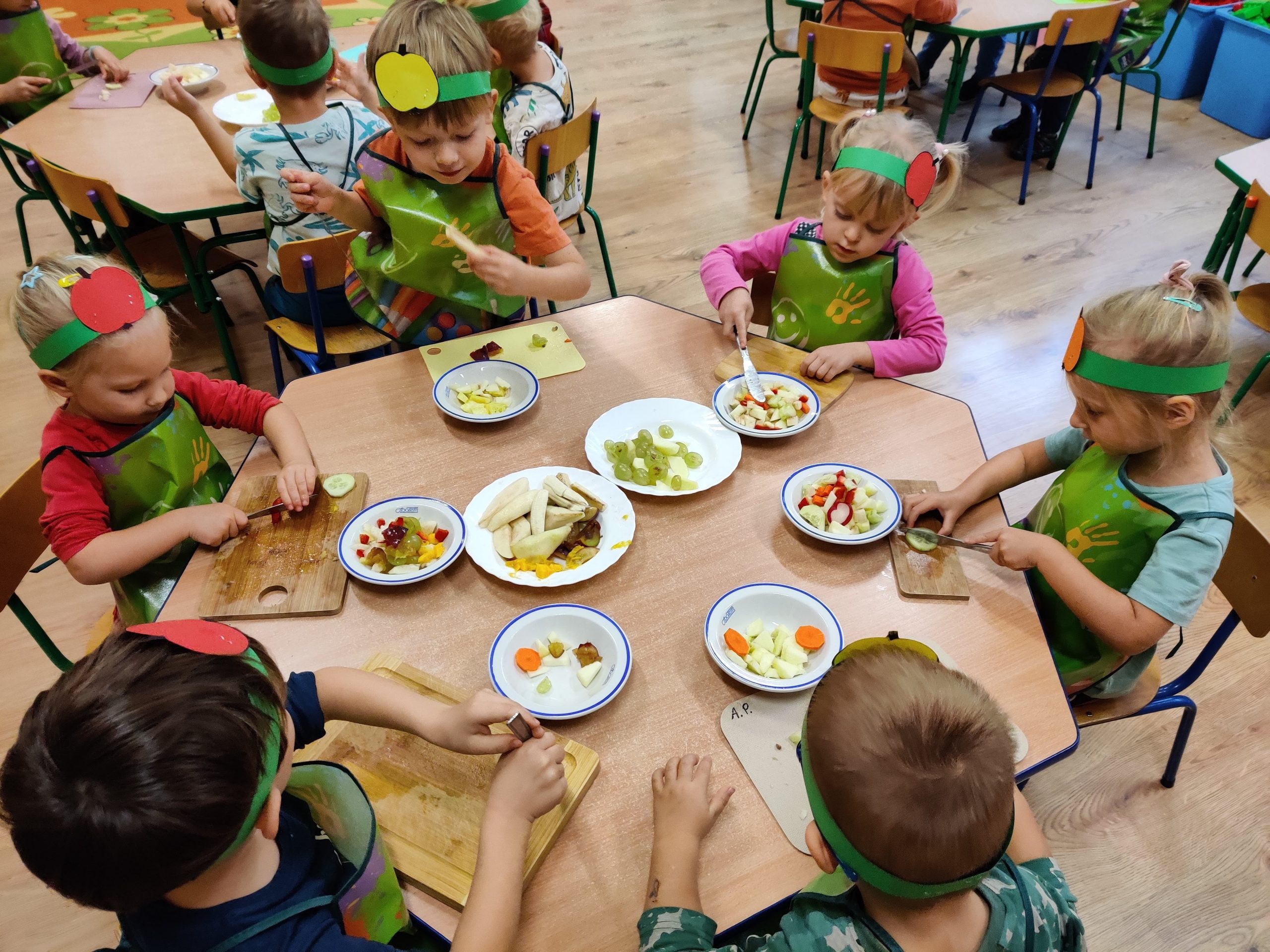 . Głównym celem zajęć było podkreślenie roli zdrowego odżywiania. Podczas zajęć Tygryski dowiedziały się jak ważne jest spożywanie owoców i warzyw w ich codziennej diecie. Wysłuchały wiersza Jana Brzechwy ,,Na straganie”. Wspomniane święto było również okazją do stworzenia owocowo- warzywnej sałatki. Dużą frajdą dla dzieci było indywidualne komponowanie zdrowej przekąski, dzięki czemu mogły nabierać samodzielności i wiary we własne możliwości. Na koniec odbyła się degustacja witaminowych pyszności. Ten wyjątkowy dzień na pewno zostanie na długo w pamięci naszych Tygrysków.
