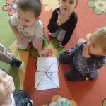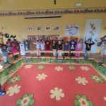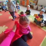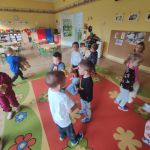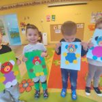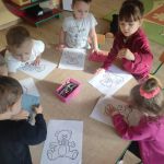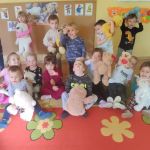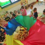 Zabawy z misiami rozpoczęły się od wspólnego zapoznania misiów z dziećmi i z salą Kangurków. Przedszkolaki poznały historię powstania pluszowego misia, wykonały wiele zadań – umieszczały misie w określonych miejscach, segregowały je i przeliczały, opisywały ich wygląd. Nie zabrakło też współzawodnictwa podczas układania misiowych puzzli, ale i też dobrej zabawy podczas tańców z misiami, próbowania misiowego przysmaku, odnajdywania właściciela misia i szaleństwa misiów na chuście. Na koniec dzieci w pracy plastycznej z użyciem origami płaskiego z kółek, zaprojektowały swoje własne misie.