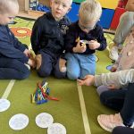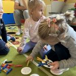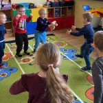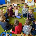 Pani Małgosia przeczytała dzieciom książkę o Elmerze „Elmer i zagubiony miś”. Następnie dzieci odpowiadały na pytania – jak nazywa się ich pluszowy miś który przyszedł dziś do przedszkola oraz z jakim misiem najbardziej lubią zasypiać w domu.