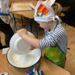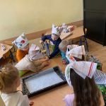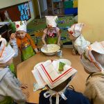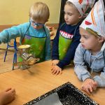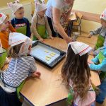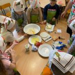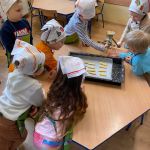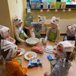 Dnia 6 lutego we wtorek w naszej grupie obchodziliśmy „tłusty czwartek”. Ponieważ wykonanie pączków jest długim i wieloetapowym procesem postanowiliśmy zrobić ciasteczka maślane, a do wyciskania różnych kształtów użyliśmy manualnej maszynki. Jak zawsze przy naszym kulinarnym doświadczaniu świata dzieci dotykały, poznawały zapachy wszelkich produktów, odmierzały składniki i wyrabiały ciasto. Wszystkie dzieci miały okazję spróbować swoich wypieków oraz otrzymały przepis i kilka ciastek do poczęstowania swoich najbliższych.