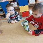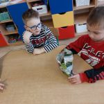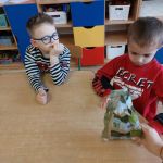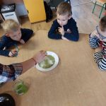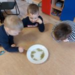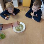 W ramach wprowadzania dzieci w świat eksperymentów – 21 lutego Sówki wykonały kolejne doświadczenie. Co potrzebowaliśmy? – głęboki talerz z wodą, – majeranek, – płyn do naczyń, – wykałaczka. Przebieg doświadczenia: Krok 1 Do głębokiego talerza nalewamy wody. Krok 2 Do talerza z wodą wsypujemy majeranek. Krok 3 Następnie moczymy wykałaczkę w płynie do naczyń i delikatnie przykładamy ją do powierzchni majeranku. Majeranek „ucieka” na boki. Dlaczego tak się stało? Ponieważ detergent (płyn do mycia naczyń) zmniejszył napięcie powierzchniowe wody, czyli zmniejszył wzajemne przyciąganie się cząsteczek wody. Ta część wody do której detergent nie zdołał dotrzeć ma nie zmienione napięcie powierzchniowe. Wskutek kontaktu z detergentem zmniejsza się napięcie powierzchniowe wody – niewidoczna błonka na jej powierzchni pęka jak przekłuty balonik. Tego dnia sprawdziliśmy również efekt poprzedniego doświadczenia – obserwacja naszej hodowli soli. Zachęcamy do podobnych eksperymentów w domu.