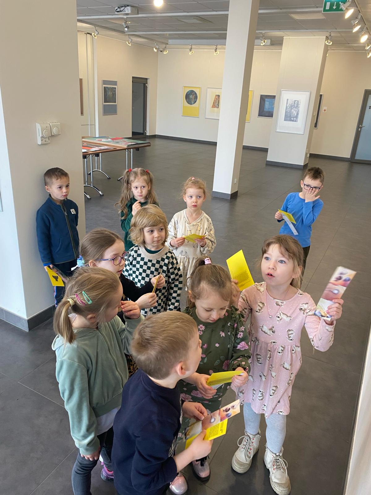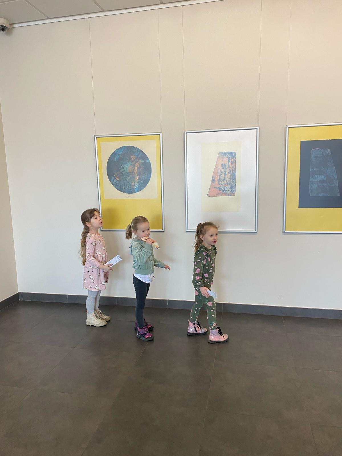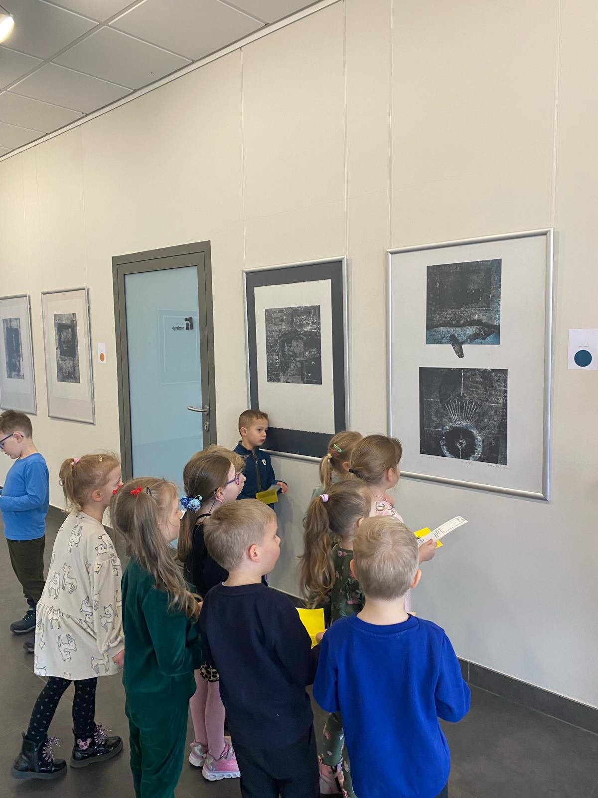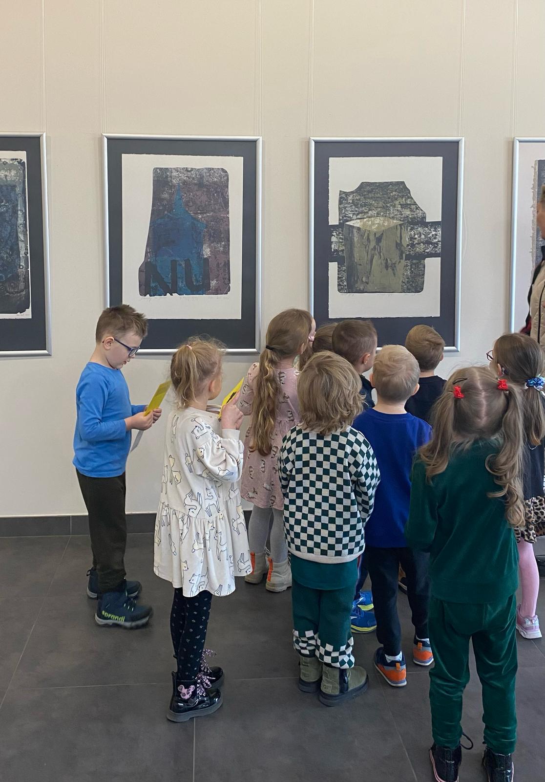27.02.2024 r. wybraliśmy się do Galerii Sztuki, gdzie prezentowana jest wystawa grafiki Pana Adama Czecha. Dzieci z wielkim zainteresowaniem oglądały ilustracje pełne tajemniczych kształtów.Dziwiły je nieco elementy umieszczone na płótnach: krzywe, okręgi, twarze, cyfry dziwne zwierzęta – ni to ptaki ni to dinozaury. Dzieci opiniowały zauważone detale, pracowała wyobraźnia i rozwijaliśmy kreatywne myślenie. Spacer odbył się w godzinach dopołudniowych i ustaliliśmy że gdy tylko pogoda nam na to pozwoli odwiedzimy galerie ponownie.