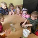W poniedziałek obchodziliśmy Dzień Wody realizując tym samym program „Mamo, tato wolę wodę”. W tym dniu dzieci poznały Zdrojka i jego przyjaciół, którzy towarzyszyli dzieciom podczas zajęć. Przedszkolaki dowiedziały się jak woda krąży w przyrodzie oraz wzięły udział w wielu eksperymentach oraz zabawach ruchowych i plastycznych. Nie mogło zabraknąć oczywiście degustacji czystej wody niegazowanej.