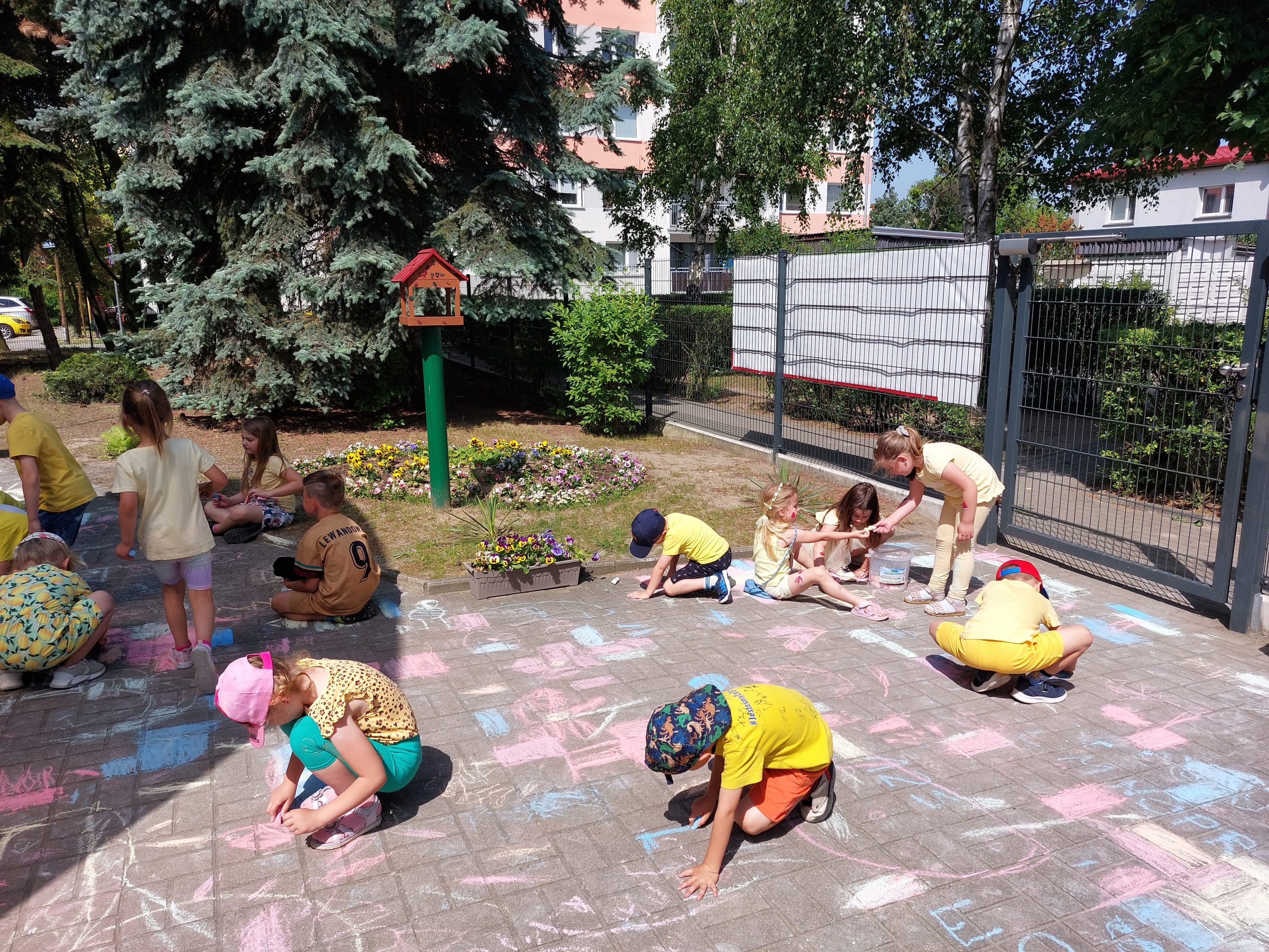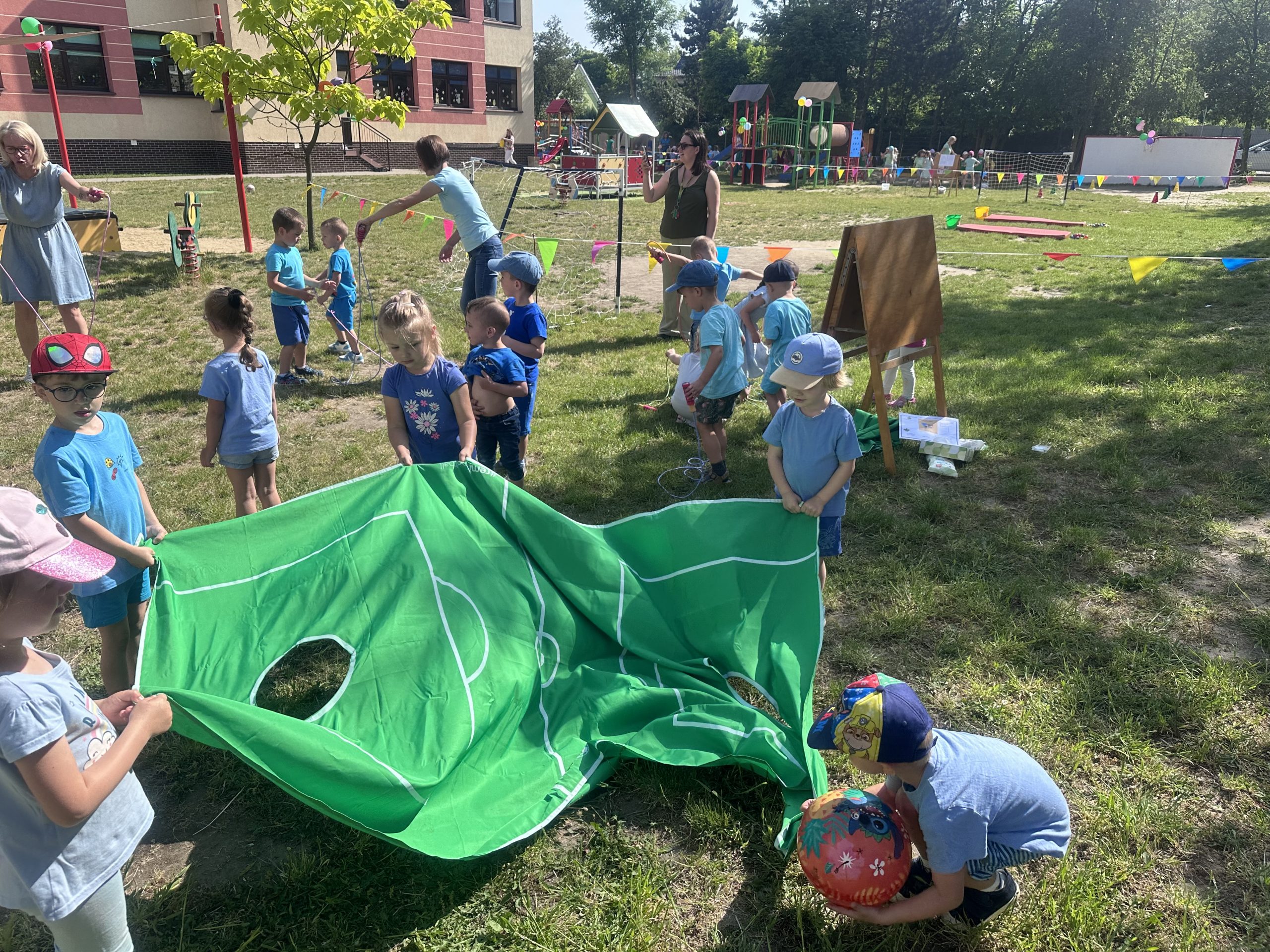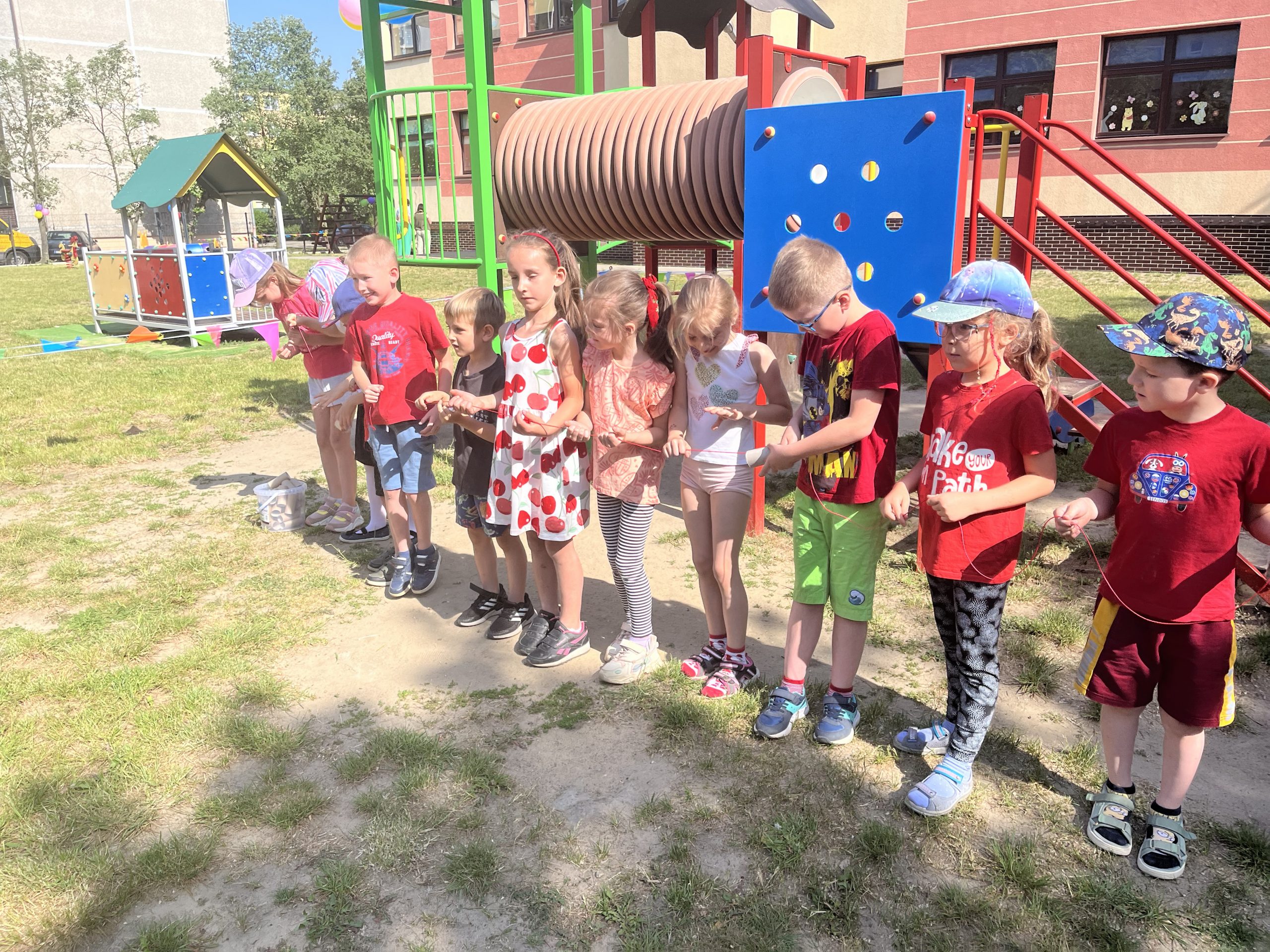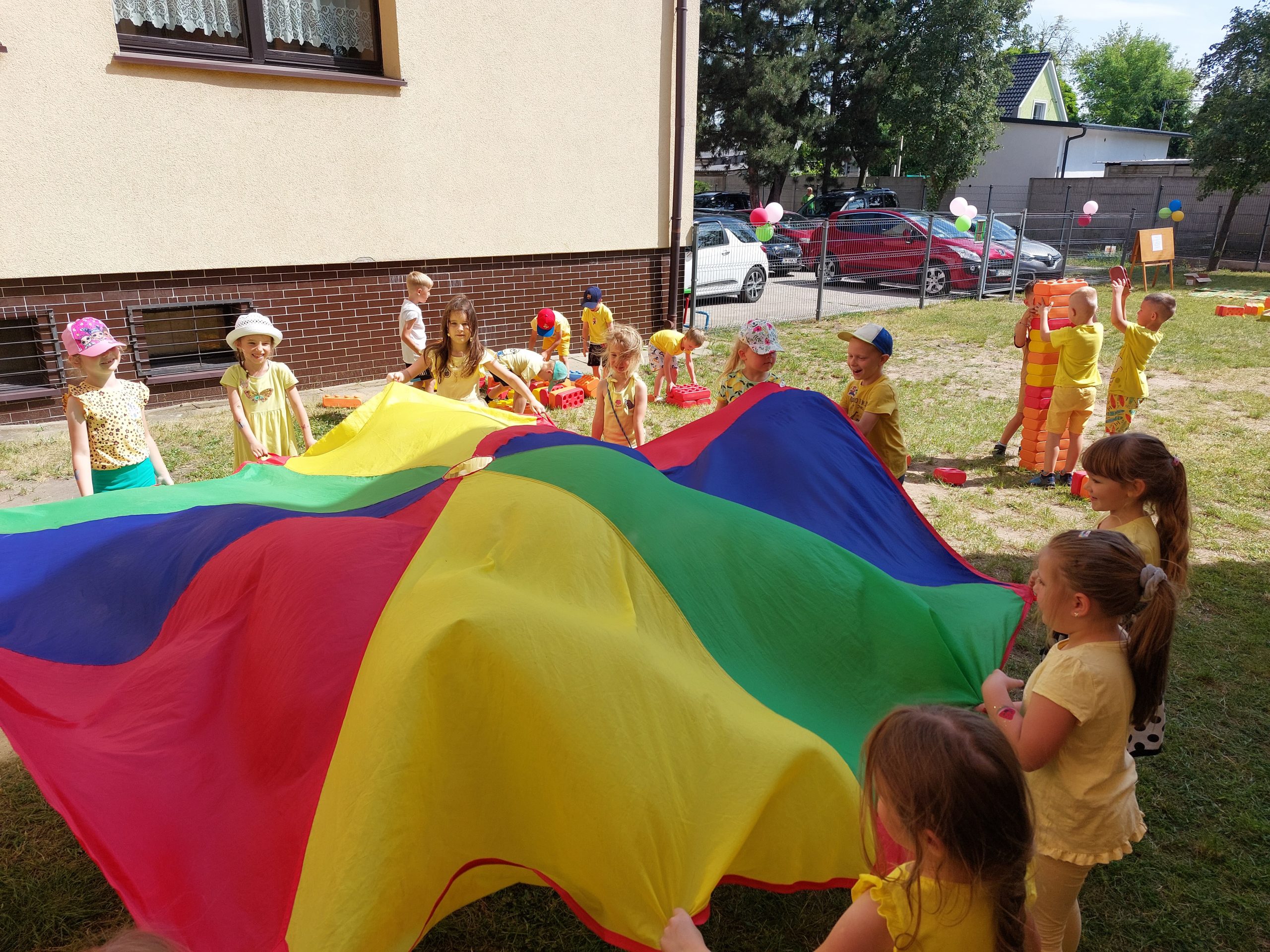 22 maja obchodziliśmy w naszym przedszkolu Kolorowy Dzień. Tym samym zaczynamy tygodniowe obchody Dnia Dziecka. W dzisiejszym dniu czekało na dzieci wiele kolorowych atrakcji. Plac zabaw zamienił się w miejsce gier, zabaw i ciekawych atrakcji zupełnie innych niż na codzień. Każda grupa w tym dniu miała na sobie ubrany inny kolor – w połączeniu udało nam się utworzyć piękną tęczę. Po życzeniu udanej zabawy przez Panią Dyrektor dzieci rozpoczęły kolorową przygodę.  W pierwszej strefie dzieci zdobiły chodnik prowadzący do wejście naszej placówki. W drugiej strefie czekały na dzieci zabawy ze skakankami, gumami do skakania, chustami animacyjnymi(boiska piłkarskie). W trzeciej strefie dzieci tworzyły kreatywne postacie z bajek mydlanych. W czwartej strefie czekały na dzieci układanki lewopółkulowe XXL, a także ciekawe zabawy z kolorami – plansze edukacyjne. W tej strefie Rodzice naszych przedszkolaków zaskoczyły dzieci malowaniem twarzy/ rąk, tatuażami i naklejkami dla wszystkich dzieci. W piątej i szóstej strefie czekały na dzieci zabawy zręcznościowe. W 7 strefie dzieci miały możliwość dostarczyć sobie wrażeń sensorycznych, gdzie do pokonania miały naturalną ścieżkę sensoryczną. W ostatniej ósmej strefie na dzieci czekały zabawy kreatywne z klockami maxi, kręglami maxi, a także zabawy z chustą animacyjną. To był udany dzień, pełen wrażeń, pogoda dopisała. Na podwieczorek czekały na dzieci kolorowe, tęczowe galaretki. Dziękujemy Radzie Rodziców za pomoc i ufundowanie artykułów potrzebnych do realizacji tego dnia.