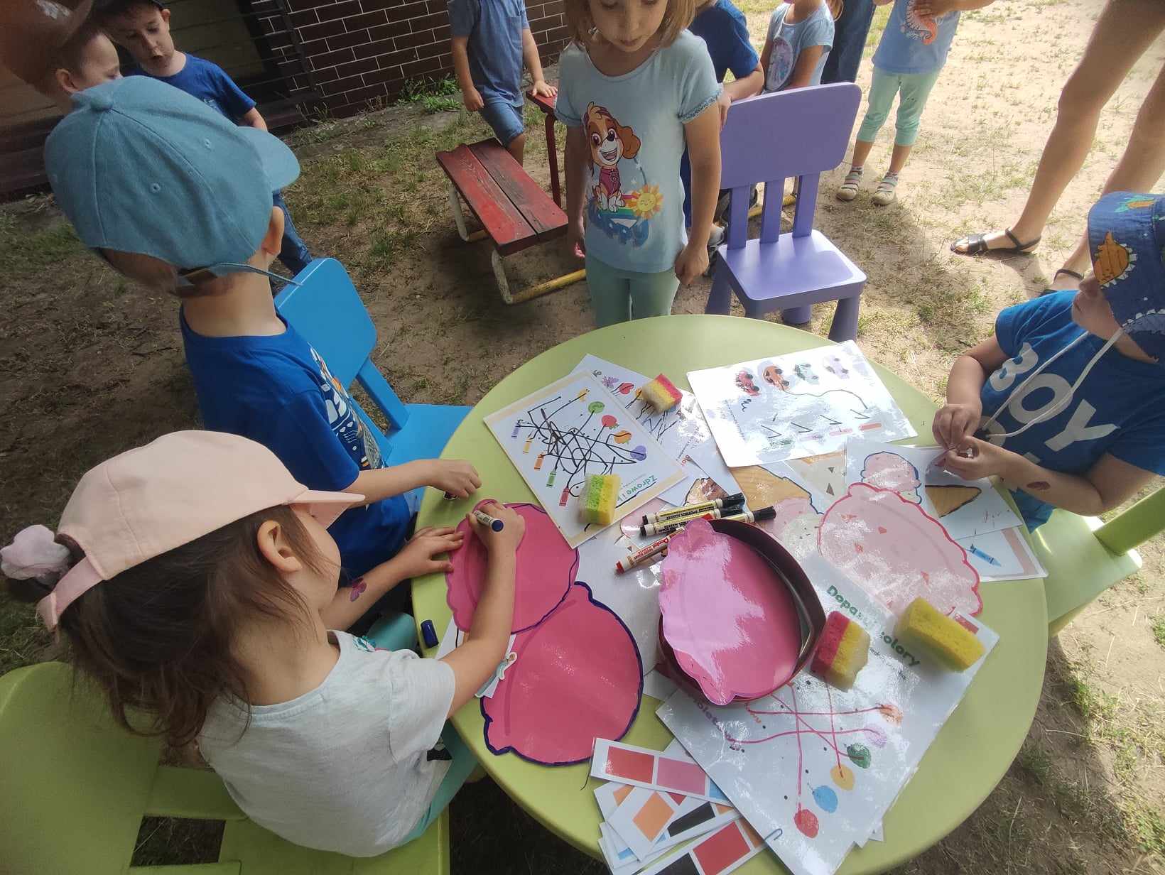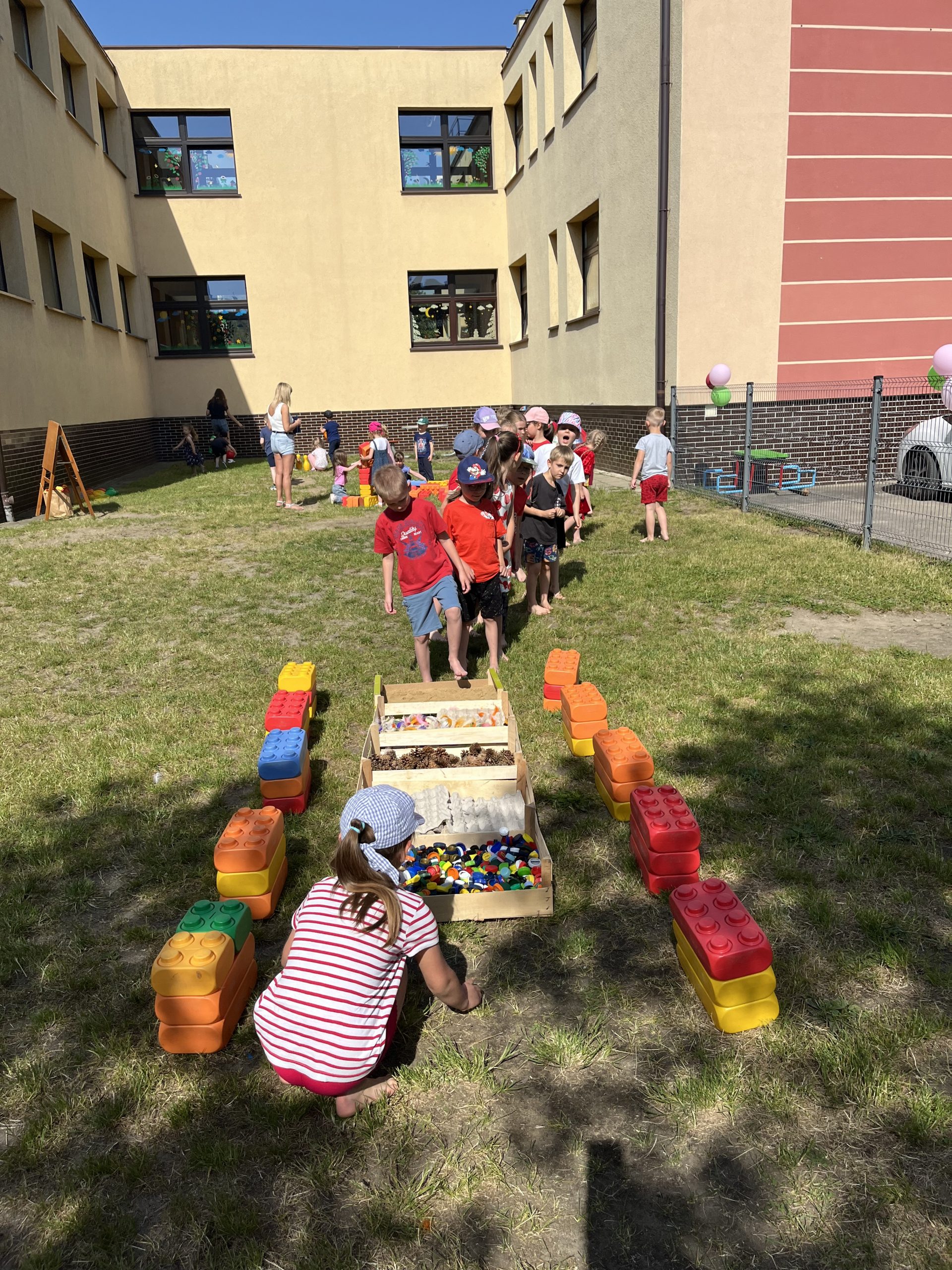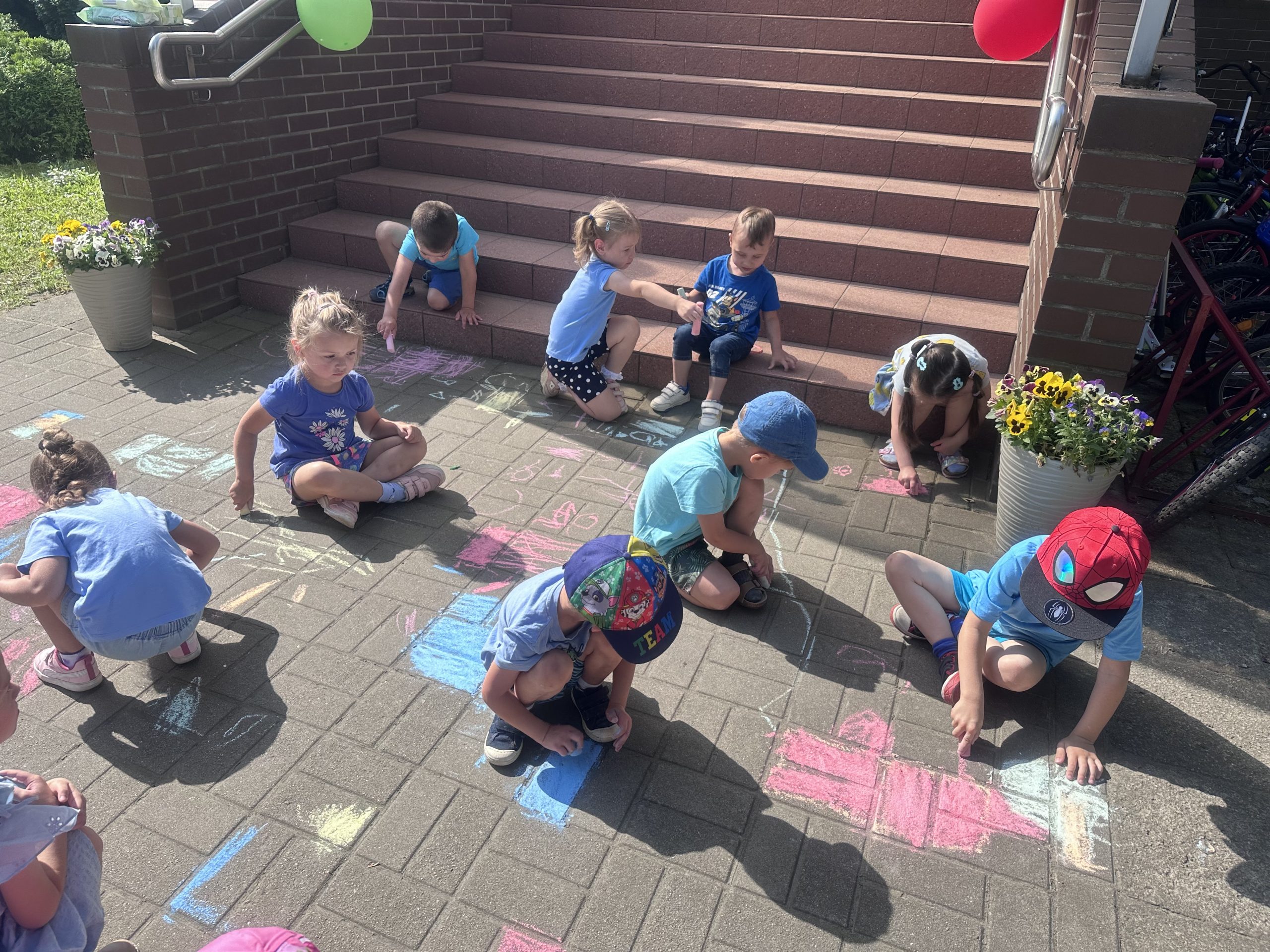 22 maja obchodziliśmy w naszym przedszkolu Kolorowy Dzień. Tym samym zaczynamy tygodniowe obchody Dnia Dziecka. W dzisiejszym dniu czekało na dzieci wiele kolorowych atrakcji. Plac zabaw zamienił się w miejsce gier, zabaw i ciekawych atrakcji zupełnie innych niż na codzień. Każda grupa w tym dniu miała na sobie ubrany inny kolor – w połączeniu udało nam się utworzyć piękną tęczę. Po życzeniu udanej zabawy przez Panią Dyrektor dzieci rozpoczęły kolorową przygodę.  W pierwszej strefie dzieci zdobiły chodnik prowadzący do wejście naszej placówki. W drugiej strefie czekały na dzieci zabawy ze skakankami, gumami do skakania, chustami animacyjnymi(boiska piłkarskie). W trzeciej strefie dzieci tworzyły kreatywne postacie z bajek mydlanych. W czwartej strefie czekały na dzieci układanki lewopółkulowe XXL, a także ciekawe zabawy z kolorami – plansze edukacyjne. W tej strefie Rodzice naszych przedszkolaków zaskoczyły dzieci malowaniem twarzy/ rąk, tatuażami i naklejkami dla wszystkich dzieci. W piątej i szóstej strefie czekały na dzieci zabawy zręcznościowe. W 7 strefie dzieci miały możliwość dostarczyć sobie wrażeń sensorycznych, gdzie do pokonania miały naturalną ścieżkę sensoryczną. W ostatniej ósmej strefie na dzieci czekały zabawy kreatywne z klockami maxi, kręglami maxi, a także zabawy z chustą animacyjną. To był udany dzień, pełen wrażeń, pogoda dopisała. Na podwieczorek czekały na dzieci kolorowe, tęczowe galaretki. Dziękujemy Radzie Rodziców za pomoc i ufundowanie artykułów potrzebnych do realizacji tego dnia.
