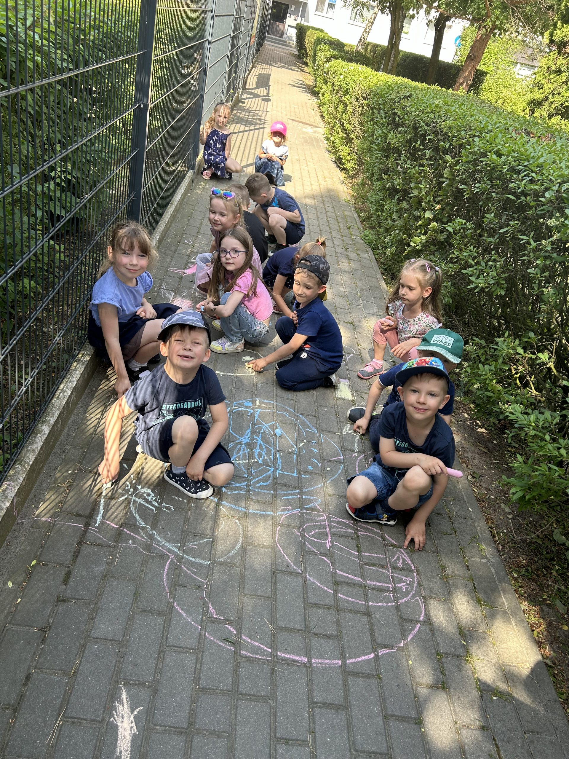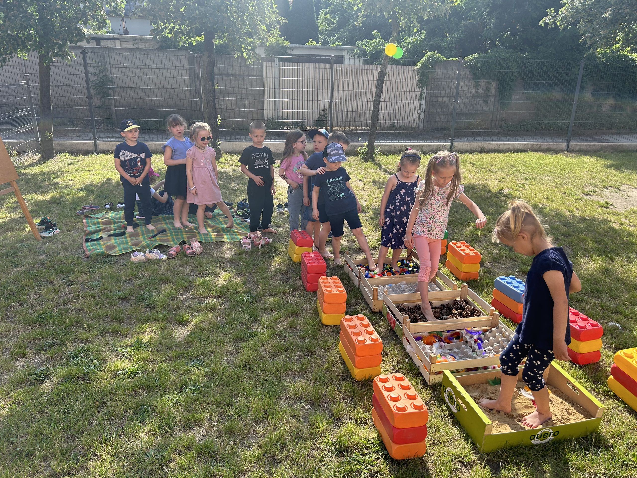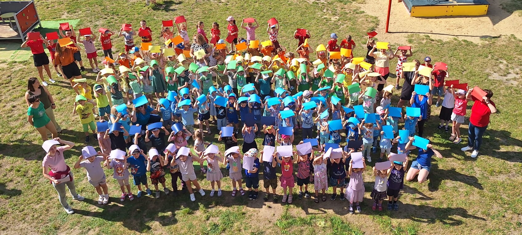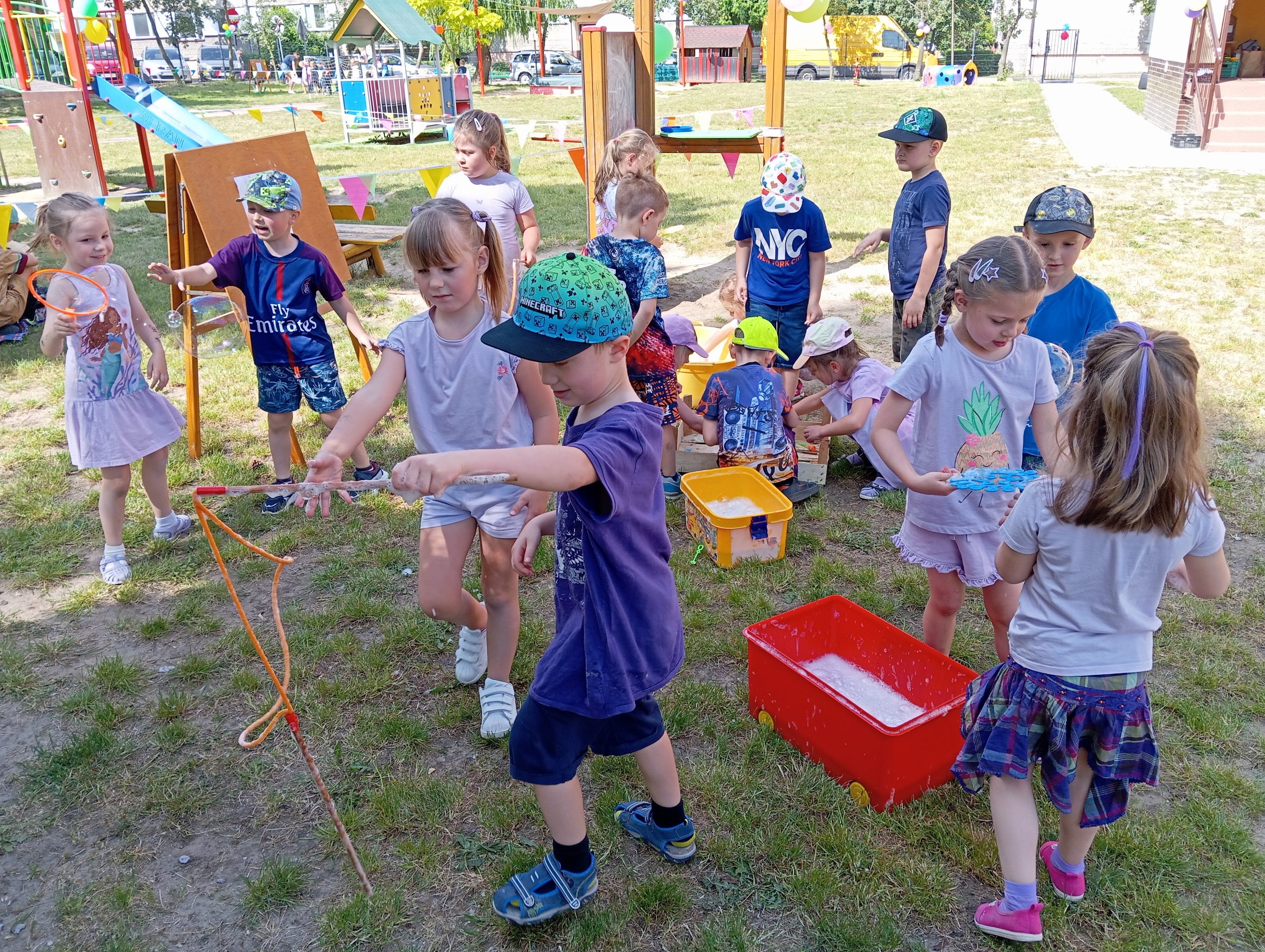 22 maja obchodziliśmy w naszym przedszkolu Kolorowy Dzień. Tym samym zaczynamy tygodniowe obchody Dnia Dziecka. W dzisiejszym dniu czekało na dzieci wiele kolorowych atrakcji. Plac zabaw zamienił się w miejsce gier, zabaw i ciekawych atrakcji zupełnie innych niż na codzień. Każda grupa w tym dniu miała na sobie ubrany inny kolor – w połączeniu udało nam się utworzyć piękną tęczę. Po życzeniu udanej zabawy przez Panią Dyrektor dzieci rozpoczęły kolorową przygodę.  W pierwszej strefie dzieci zdobiły chodnik prowadzący do wejście naszej placówki. W drugiej strefie czekały na dzieci zabawy ze skakankami, gumami do skakania, chustami animacyjnymi(boiska piłkarskie). W trzeciej strefie dzieci tworzyły kreatywne postacie z bajek mydlanych. W czwartej strefie czekały na dzieci układanki lewopółkulowe XXL, a także ciekawe zabawy z kolorami – plansze edukacyjne. W tej strefie Rodzice naszych przedszkolaków zaskoczyły dzieci malowaniem twarzy/ rąk, tatuażami i naklejkami dla wszystkich dzieci. W piątej i szóstej strefie czekały na dzieci zabawy zręcznościowe. W 7 strefie dzieci miały możliwość dostarczyć sobie wrażeń sensorycznych, gdzie do pokonania miały naturalną ścieżkę sensoryczną. W ostatniej ósmej strefie na dzieci czekały zabawy kreatywne z klockami maxi, kręglami maxi, a także zabawy z chustą animacyjną. To był udany dzień, pełen wrażeń, pogoda dopisała. Na podwieczorek czekały na dzieci kolorowe, tęczowe galaretki. Dziękujemy Radzie Rodziców za pomoc i ufundowanie artykułów potrzebnych do realizacji tego dnia.