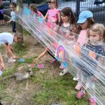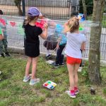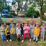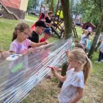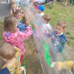 Dnia 24.05.2024 r. wszystkie grupy udały się na przedszkolny plac zabaw. Tam czekała na nich niespodzianka. Przedszkolne drzewa owinięte folią spożywczą posłużyły dzieciom jako płótno. Malowanie na folii to zupełnie inna forma działań plastycznych oraz sensorycznych. Malując na folii dzieci stymulują zmysł dotyku oraz wzroku. Jest to także doskonałe ćwiczenie motoryki małej, koordynacji wzrokowo-ruchowej oraz kreatywności.