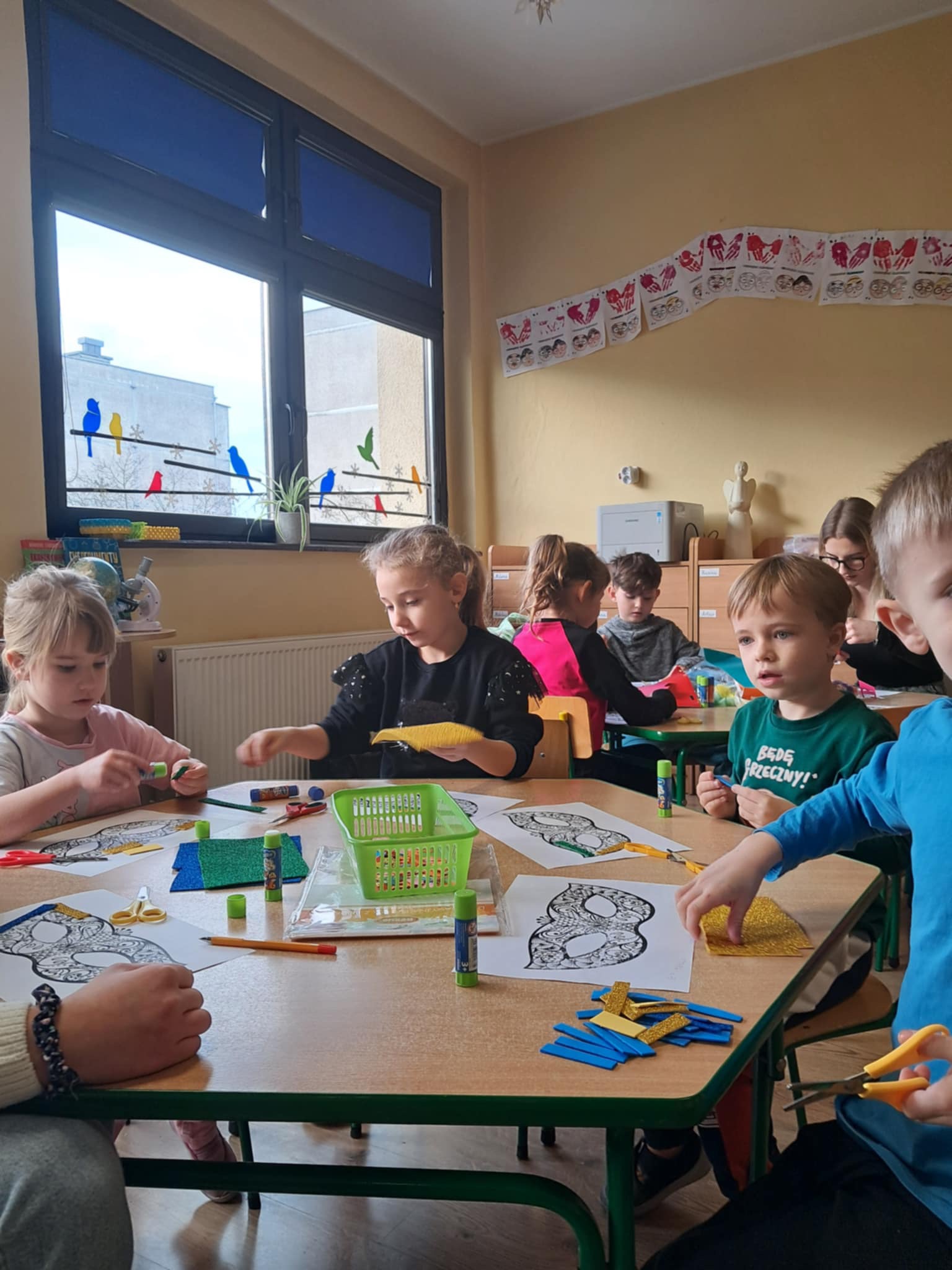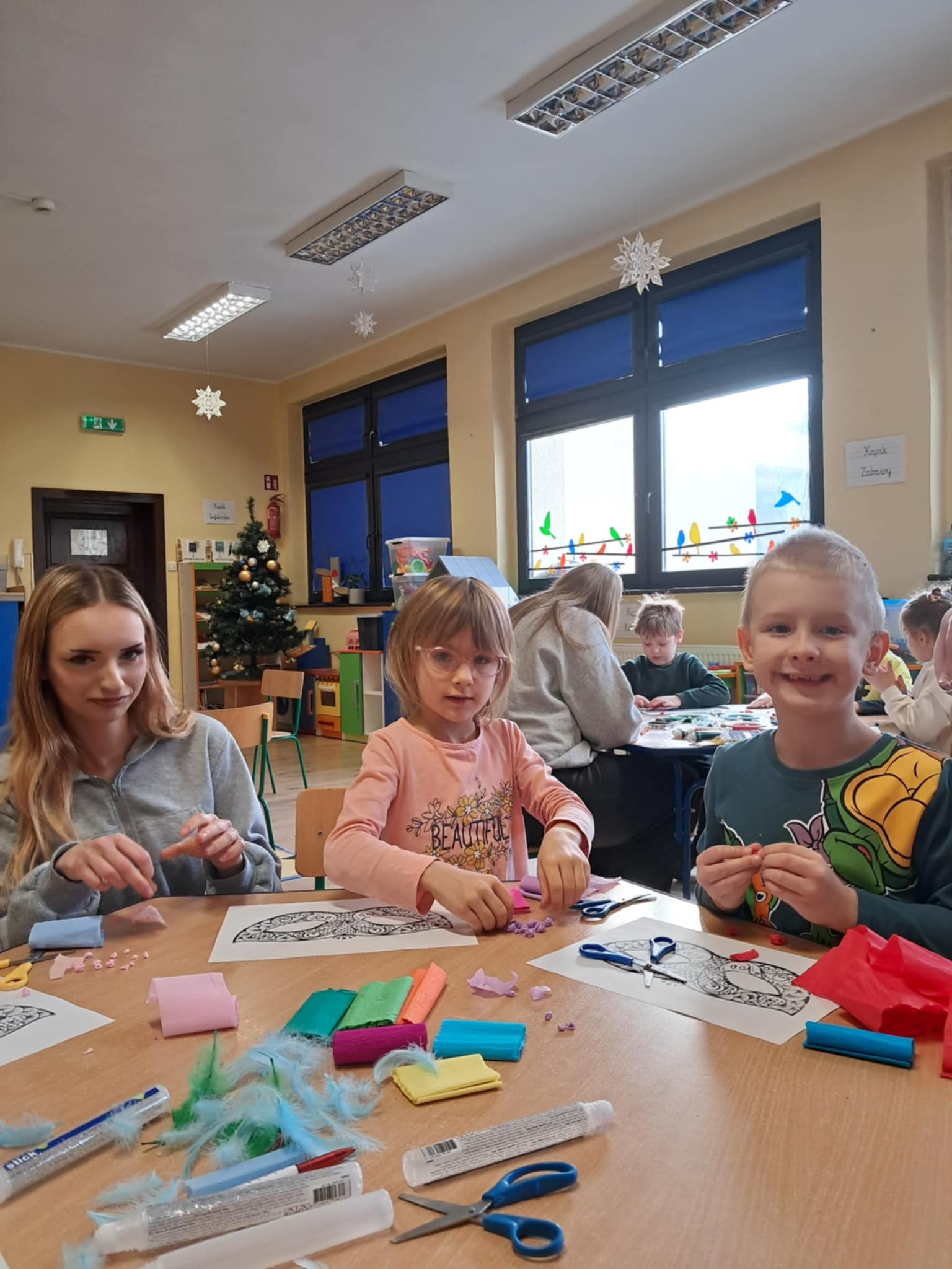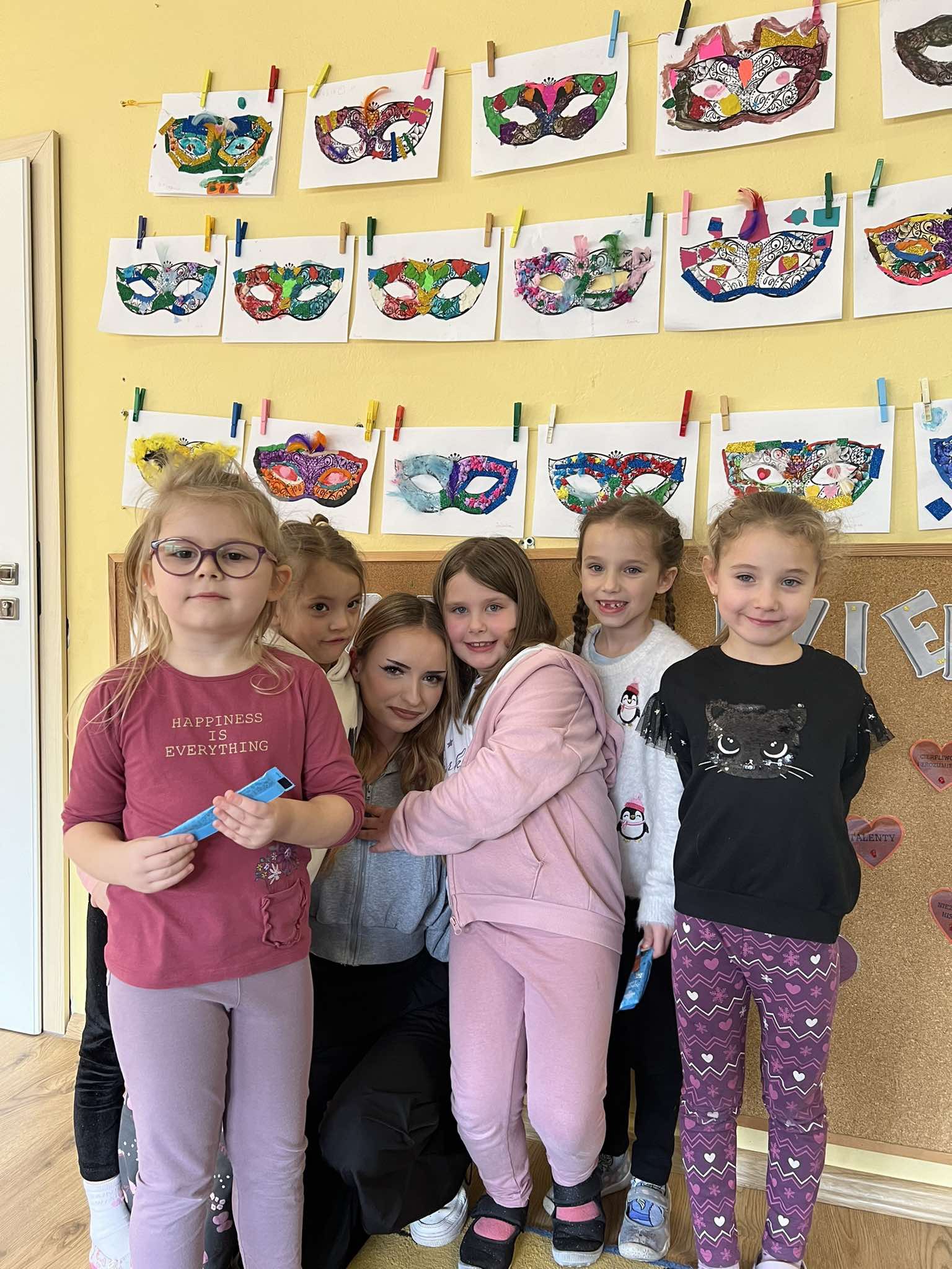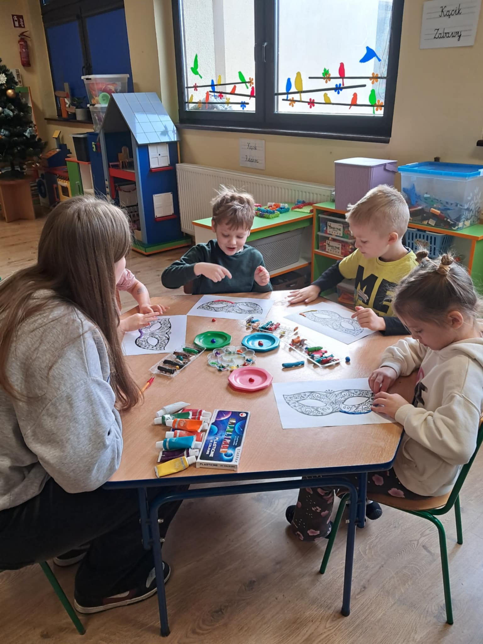 W dniu 14 stycznia do naszej grupy przybyło Koło Wolontariatu przy Szkole ZSBE w Ostrowie Wielkopolskim wraz z Panią Iloną. Wolontariuszki wspierały nasze dzieci podczas wykonywania pracy plastycznej – maska karnawałowa. Dzięki współpracy mogły zawiązać się nowe znajomości. Pomimo różnicy wieku bawili się znakomicie – przy stołach dało się słyszeć ciekawe rozmowy i śmiech. Nie będzie to nasze ostatnie spotkanie z dziewczynami z Wolontariatu. Już planujemy kolejną wizytę wiosną. Dziękujemy bardzo serdecznie naszym gościom za wizytę.