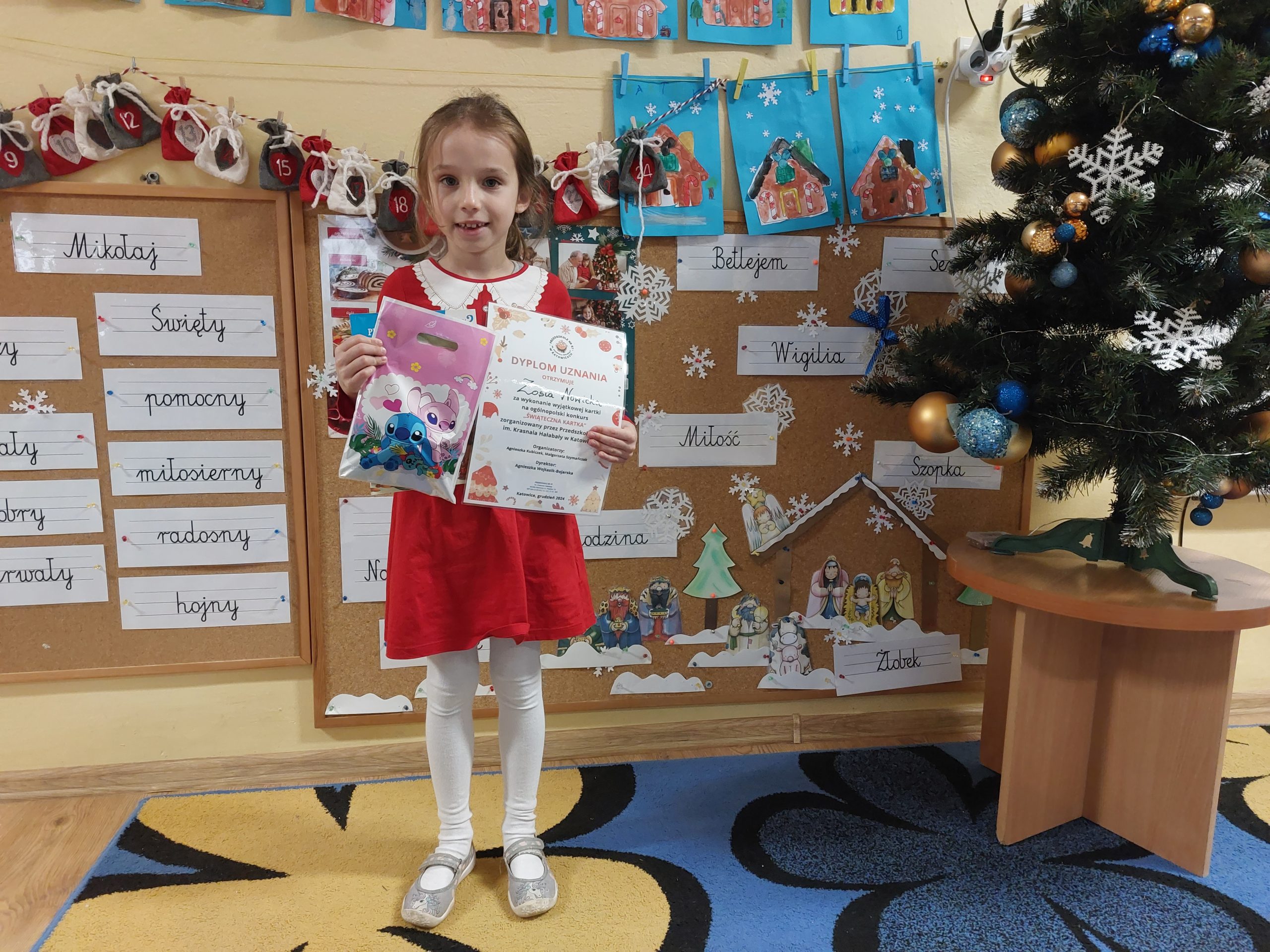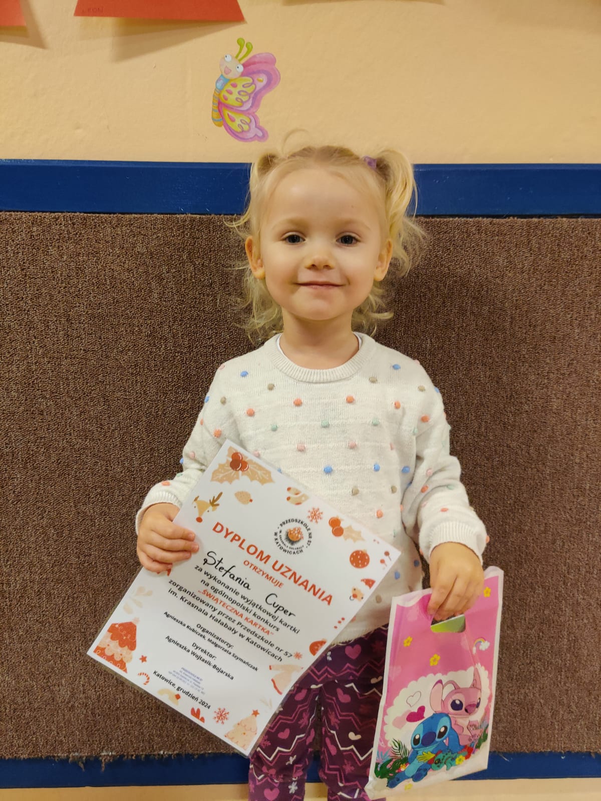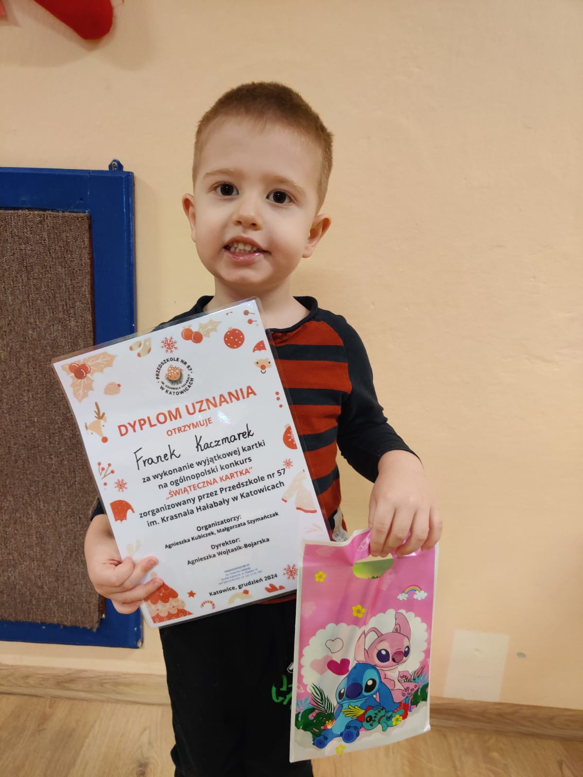 Dzieci z grupy Pszczółek i dzieci z grupy Puchatków wzięły udział w konkursie plastycznym „Świąteczna kartka” zorganizowanego przez Przedszkole nr 57 im. Krasnala Hałabały w Katowicach.