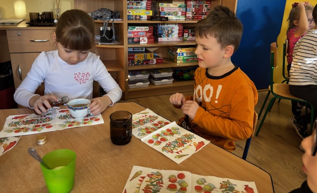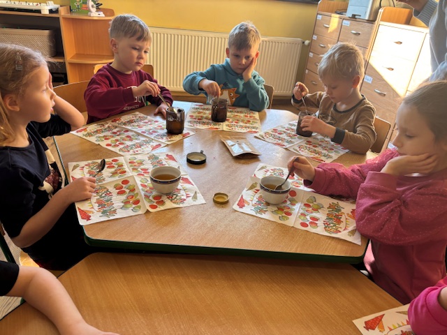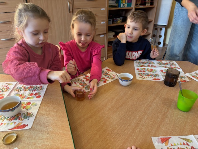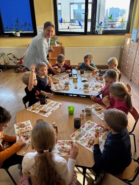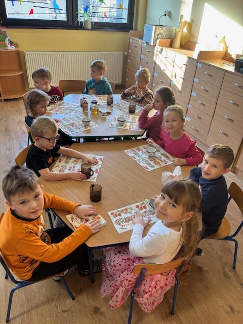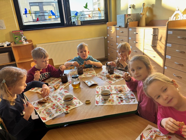 22 stycznia w naszej grupie obchodziliśmy DZIEŃ ROGALIKA I HERBATKI Od razu po śniadaniu wybraliśmy się na spacer do sklepiku – piekarni MIMA położonego bardzo blisko naszego przedszkola. Panie ekspedientki pokazały dzieciom wszystkie dostępne wyroby rogalikowe. Zakupiliśmy dla każdego przedszkolaka po rogaliku i faworku i udaliśmy się do naszej sali, aby zaparzyć zimową herbatkę. Nie brakowało pogadanki na temat wypieków które można kupić w piekarni. Dzieci obejrzały też krótki filmik na temat produkcji rogalików. Dzieci popijały herbatkę smakując pysznych wypieków. To był bardzo miły dzień.