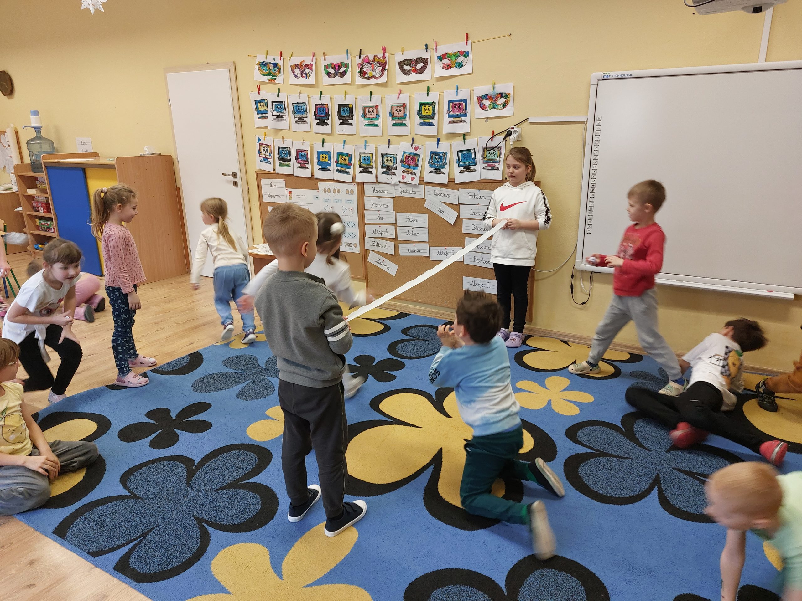 Dzieci uporały się również z zagadkami słownymi w zabawie „Powiedz o czym białym myślę”.