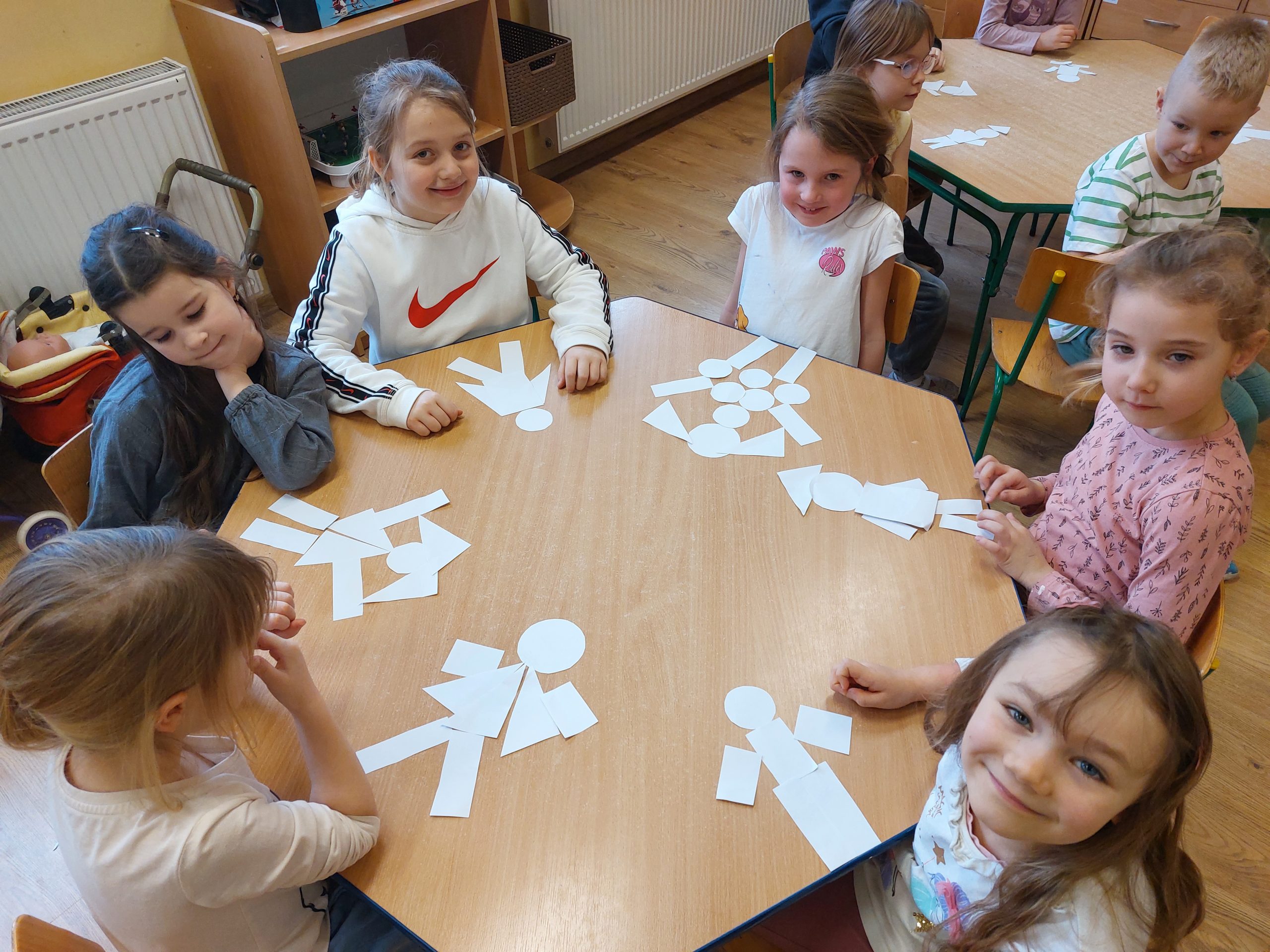 Przy stolikach dzieci układały BIAŁOLUDKI – z wyciętych białych figur geometrycznych. Każdy przedszkolak dzielnie pracował a na koniec nadał imię swojemu „białoludkowi”.