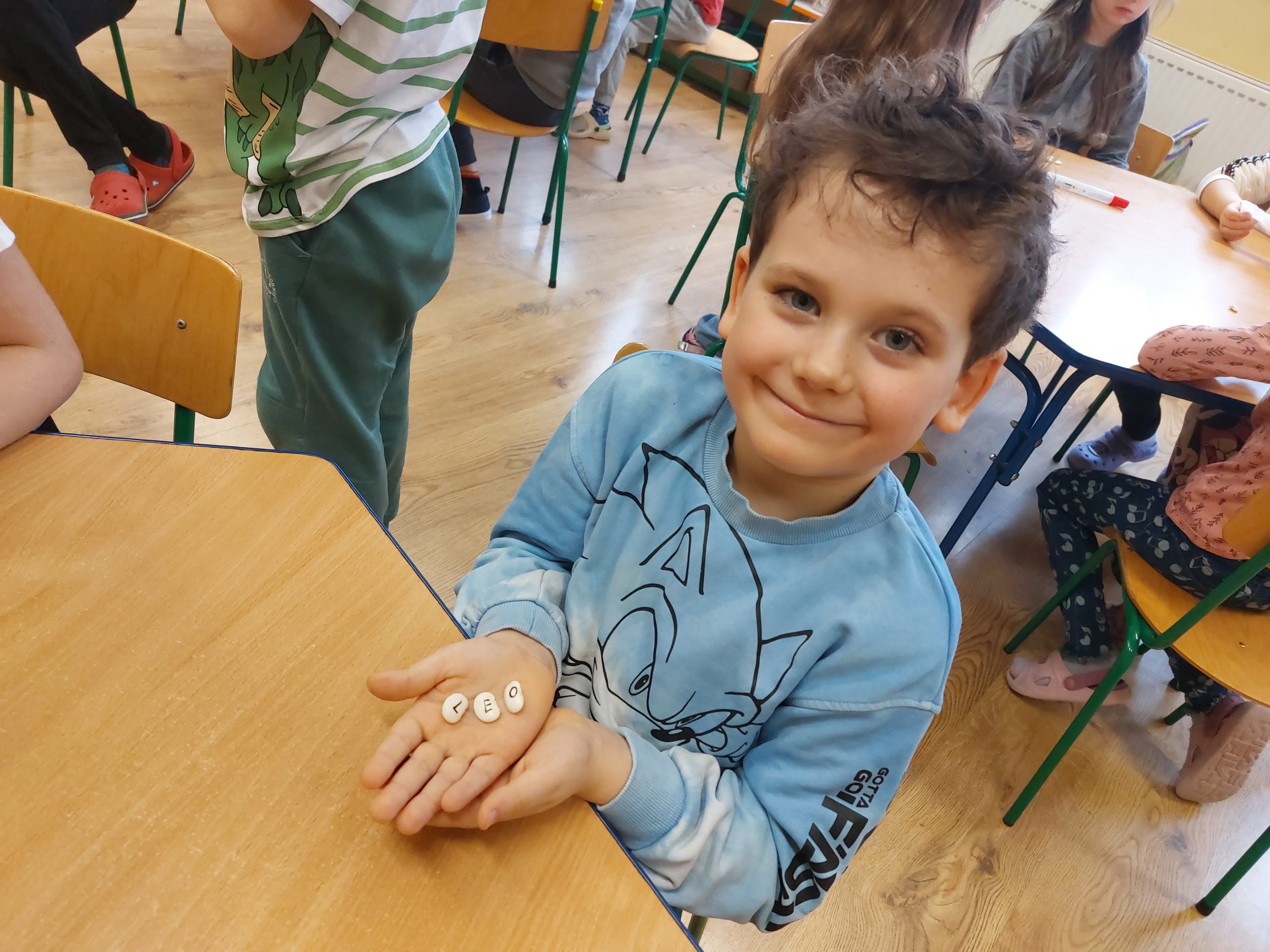 Dodatkowo przedszkolaki miały za zadanie napisać wszystkie litery wchodzące w skład swojego imienia na białych fasolkach. Zabawy było co niemiara. Okazało się że to zadanie nie było aż takie proste.