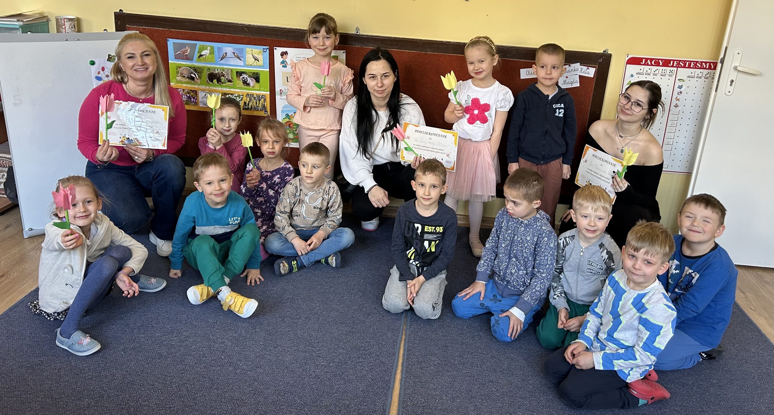 To jednak nie koniec niespodzianek! Każda dziewczynka otrzymała prezent, a nasi mali dżentelmeni przygotowali dla nich własnoręcznie wykonane tulipany z papieru. Radość i uśmiechy nie schodziły z twarzy wszystkich dzieci!