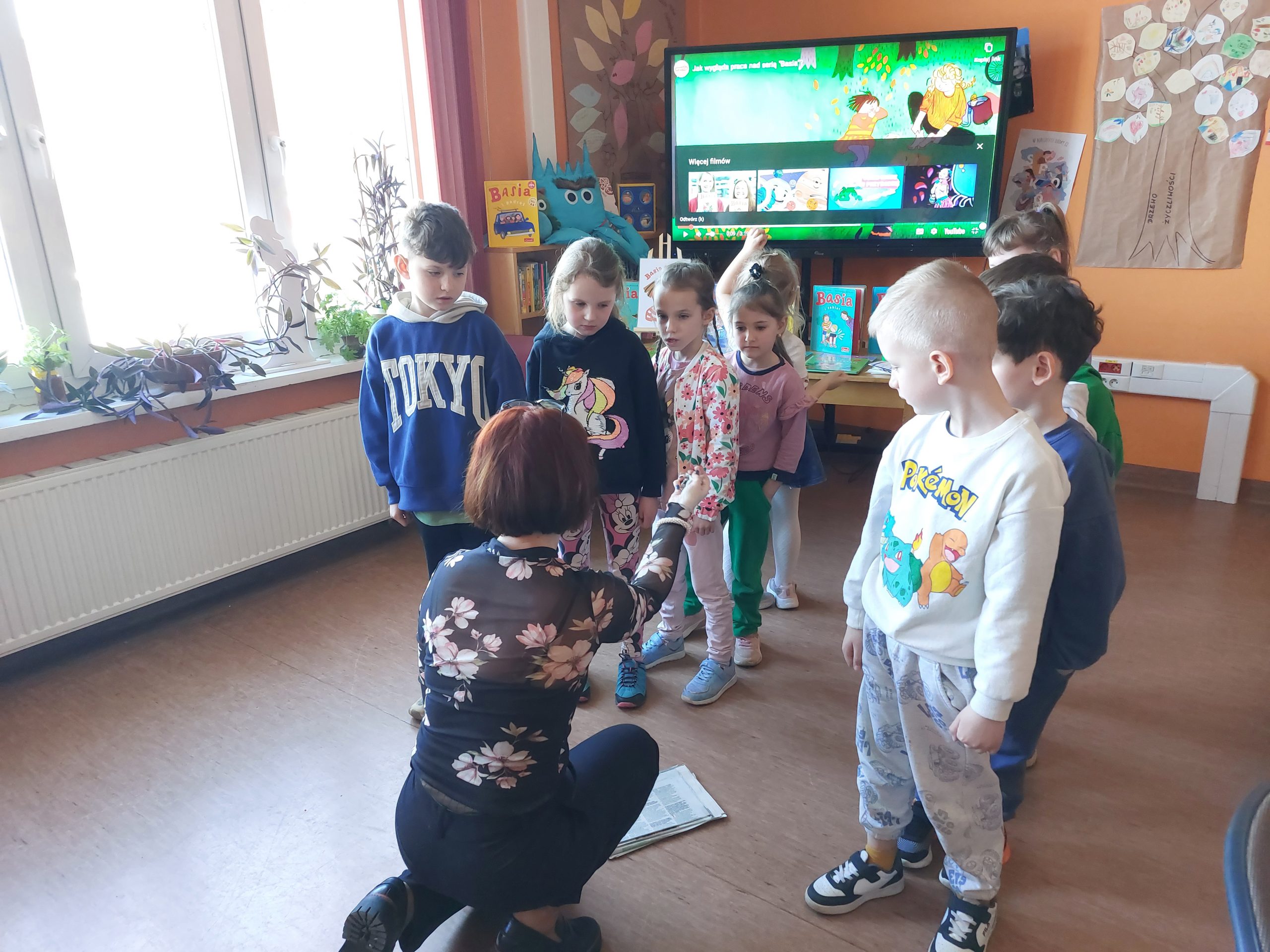 Na dywanie dzieci odpowiadały na pytania Pani Gosi. Nie brakowało ciekawych pytań ze strony naszych przedszkolaków.