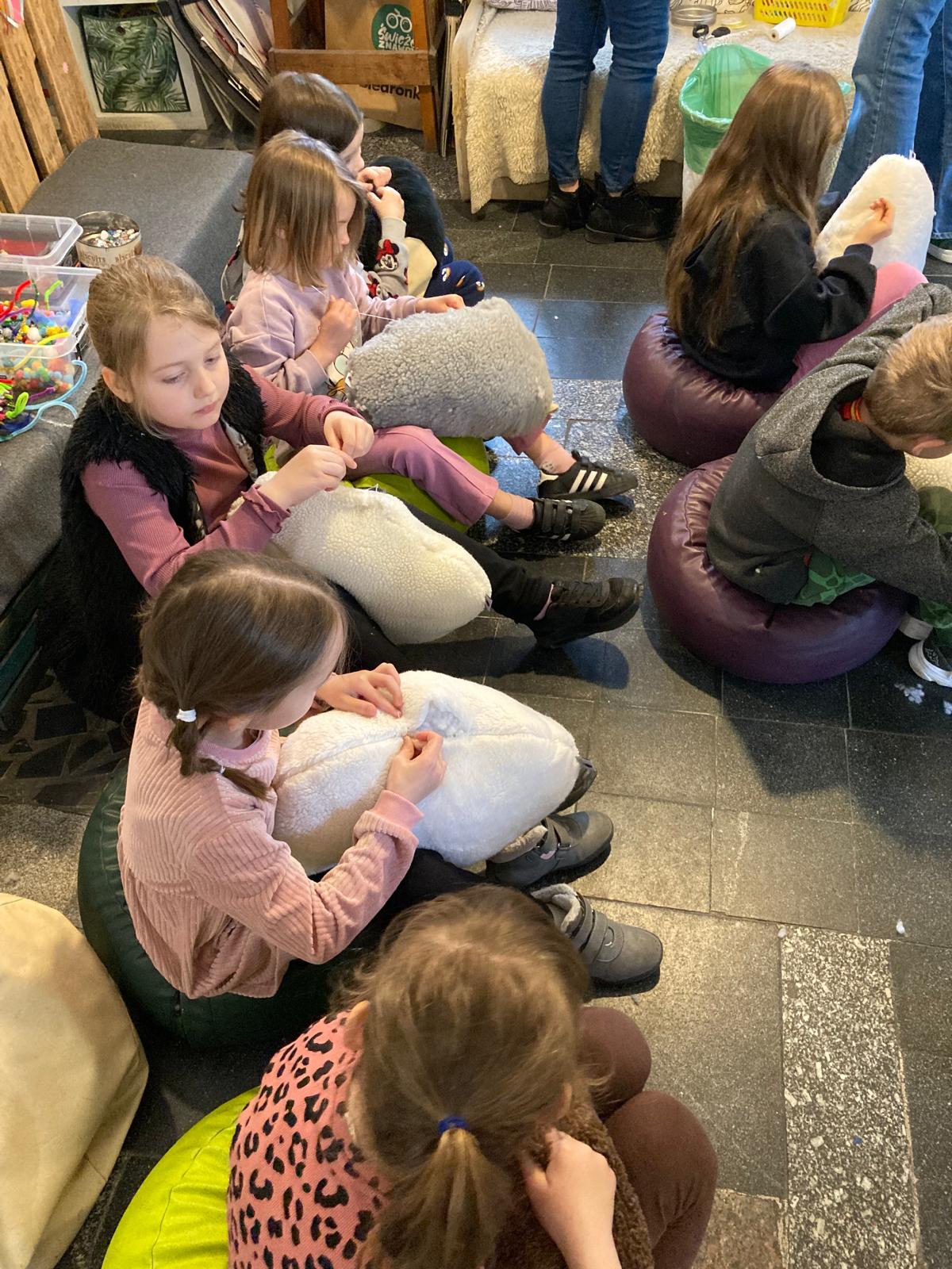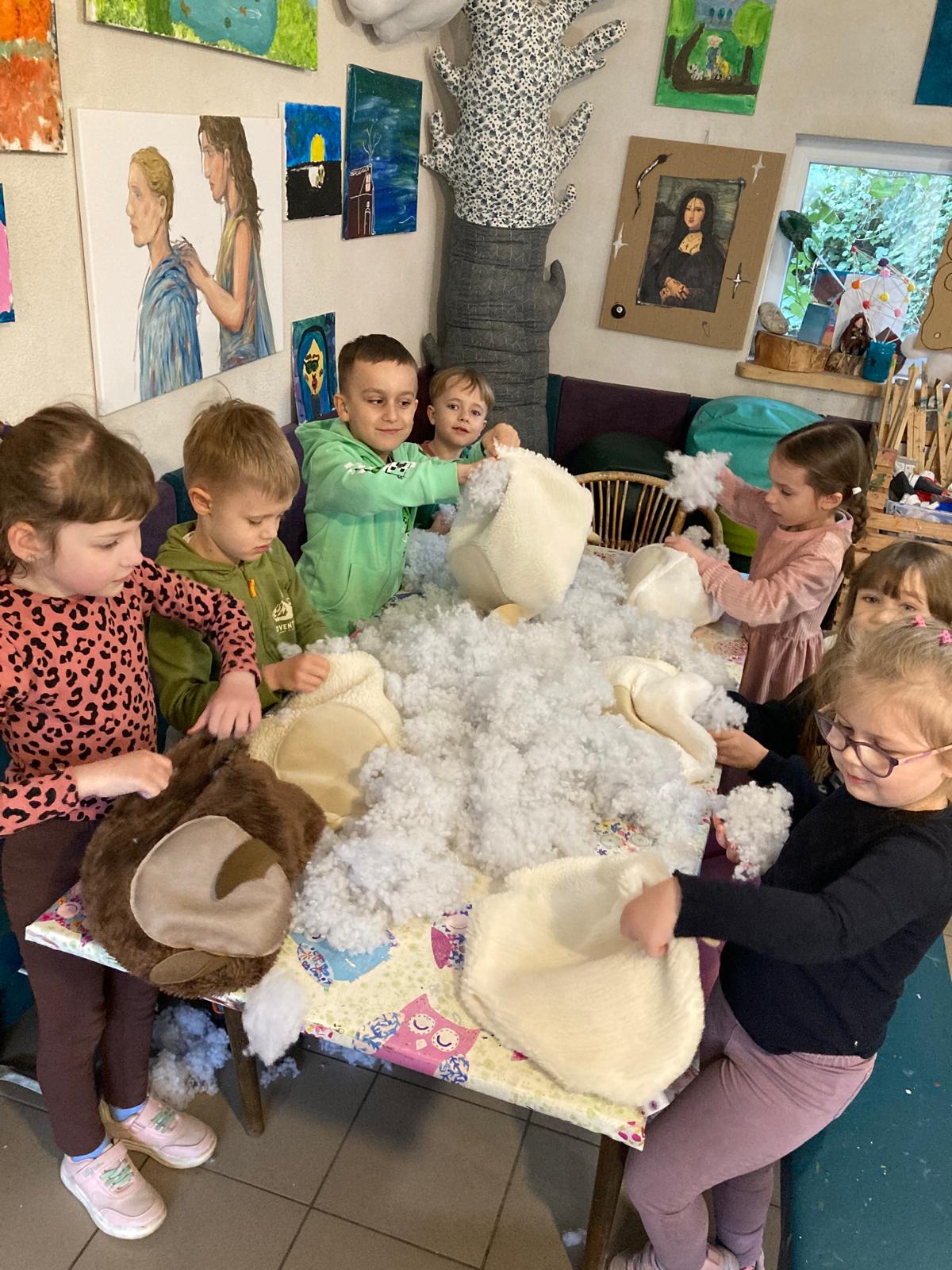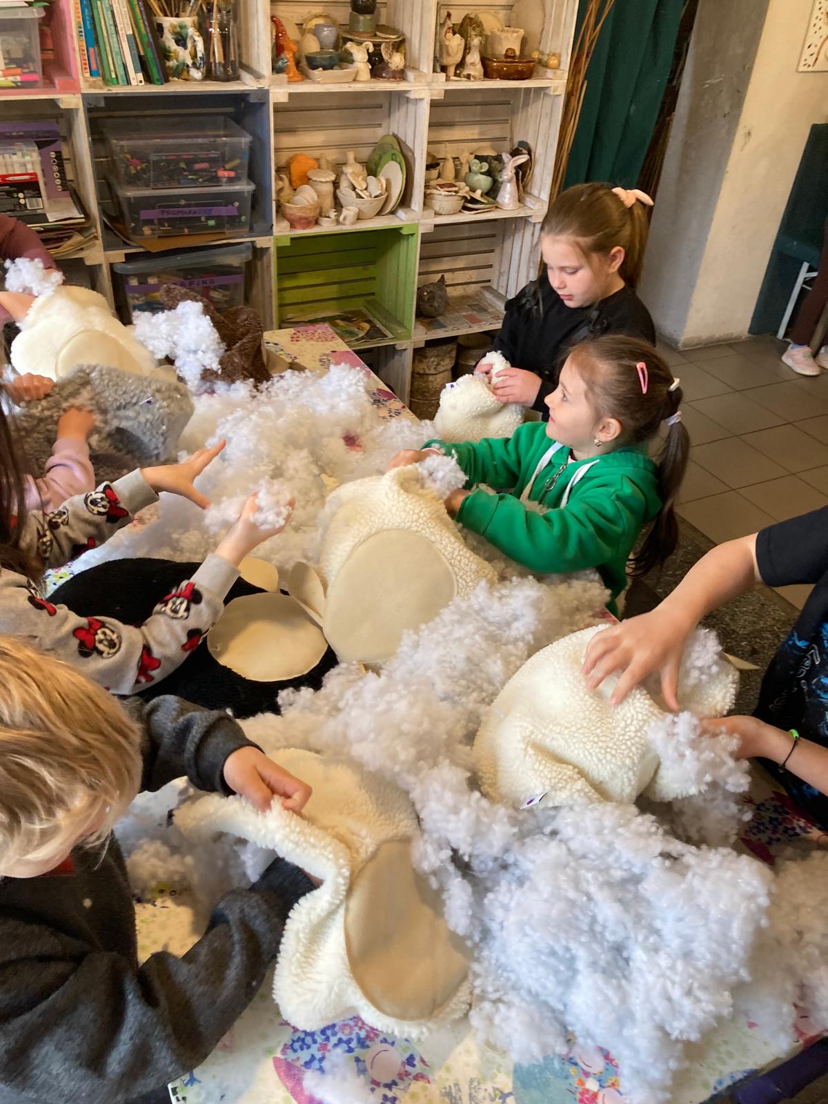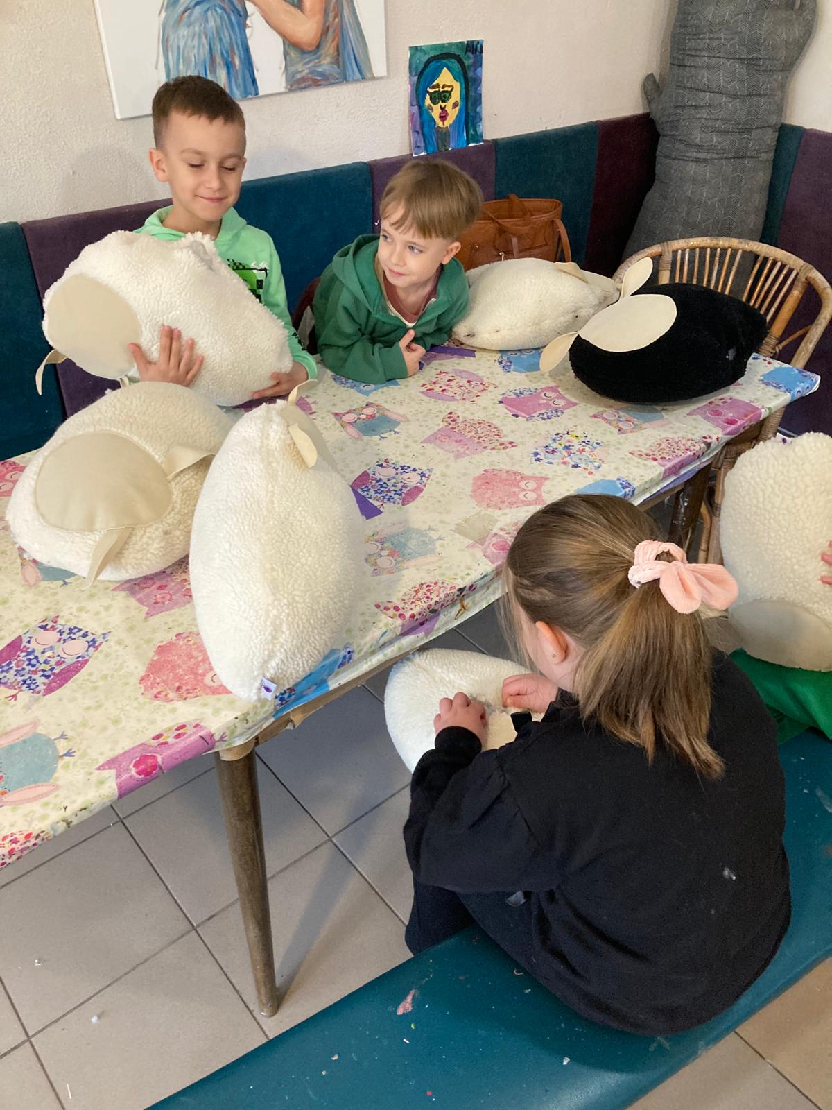 Dzieci miały okazję stworzyć piękne poduszki – baranki, samodzielnie wypełniając je pluszem i tworząc wg własnego pomysłu ich wygląd. Podczas warsztatów dzieci samodzielnie zszywały swoje poduszki, co dla wielu z nich było pierwszym doświadczeniem w pracy z igłą i nitką, a także świetną okazją do nauki nowych umiejętności manualnych.