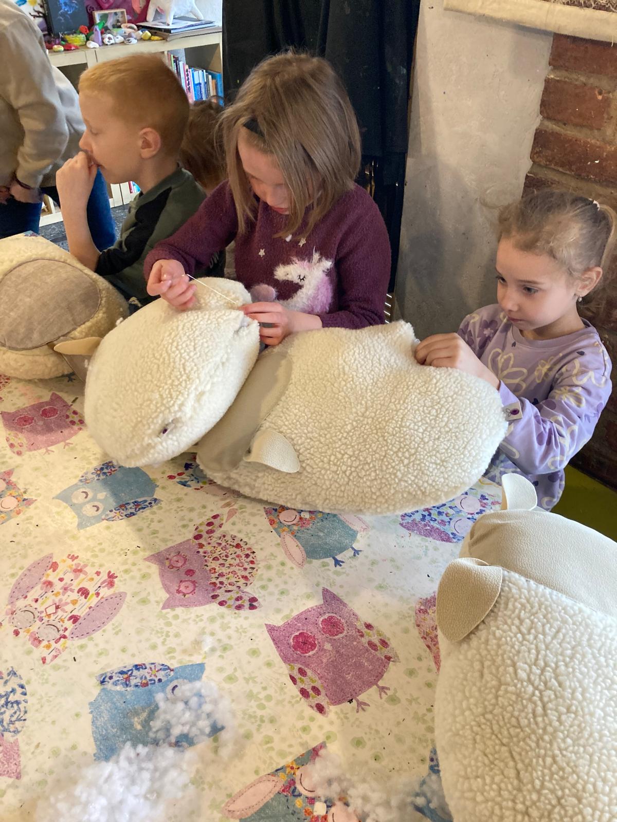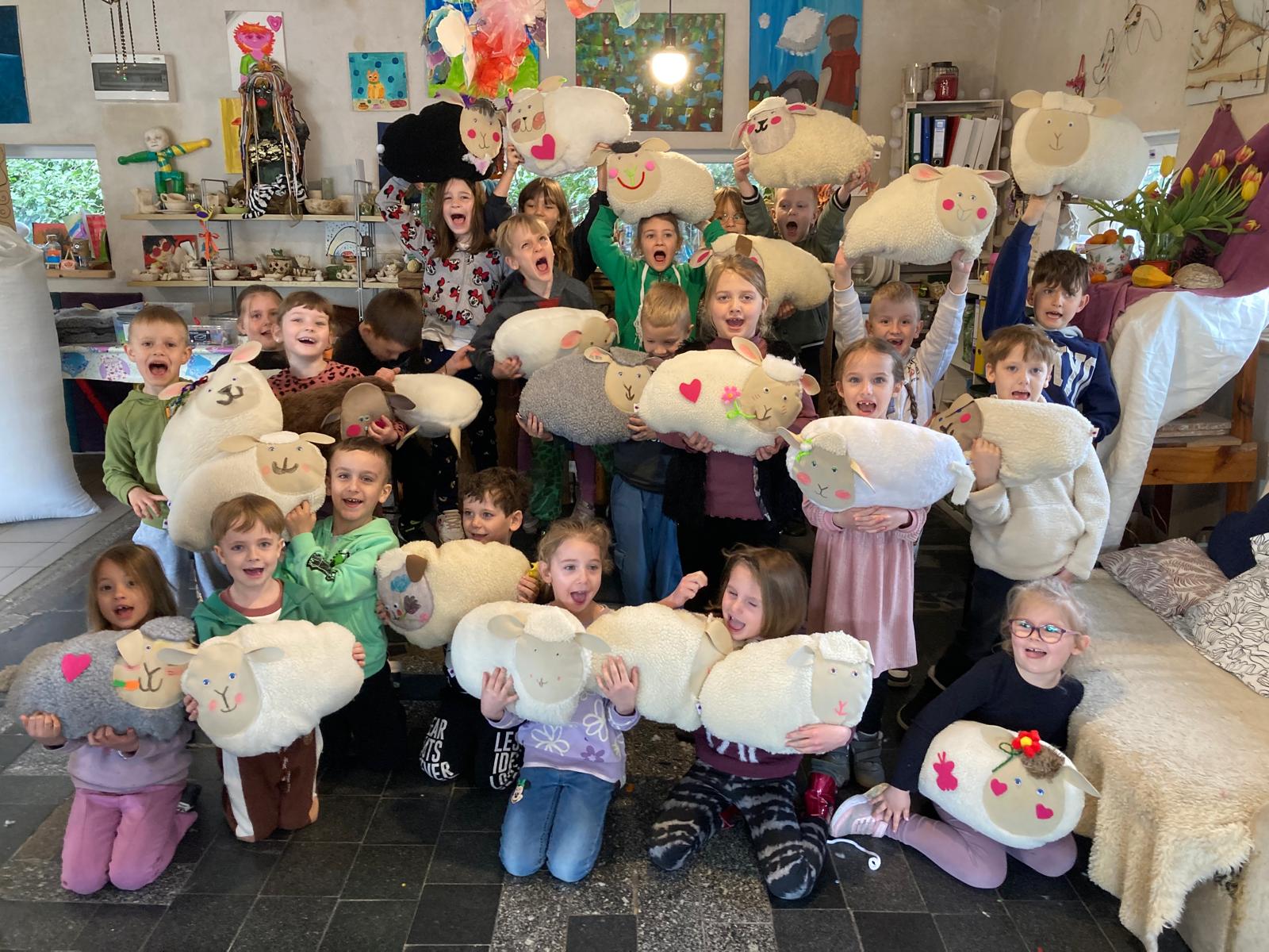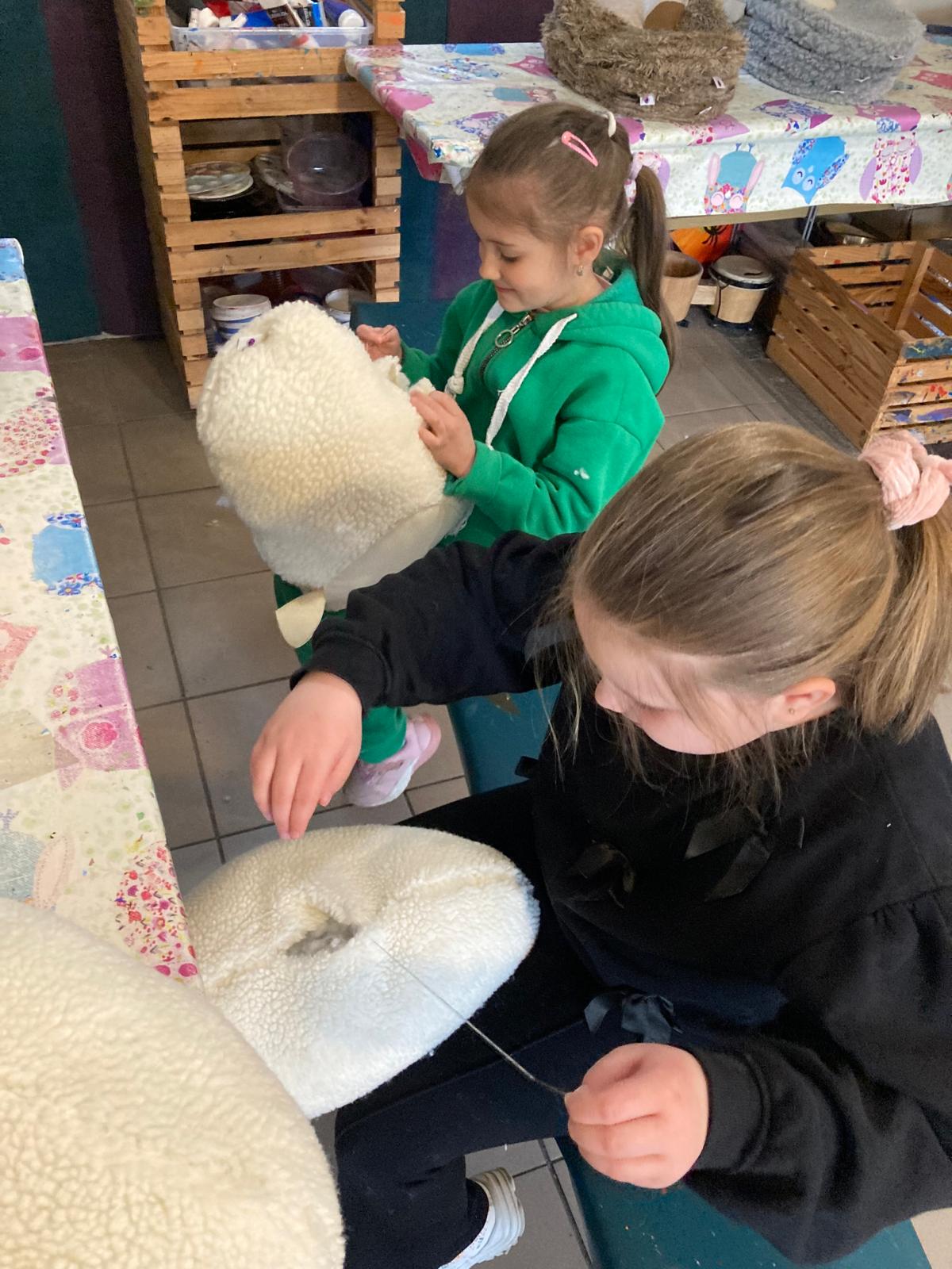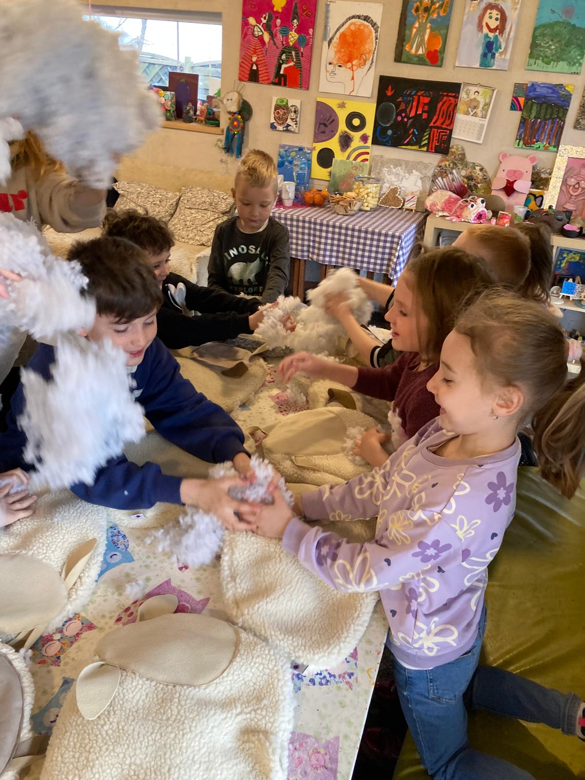 Dzieci miały okazję stworzyć piękne poduszki – baranki, samodzielnie wypełniając je pluszem i tworząc wg własnego pomysłu ich wygląd. Podczas warsztatów dzieci samodzielnie zszywały swoje poduszki, co dla wielu z nich było pierwszym doświadczeniem w pracy z igłą i nitką, a także świetną okazją do nauki nowych umiejętności manualnych.