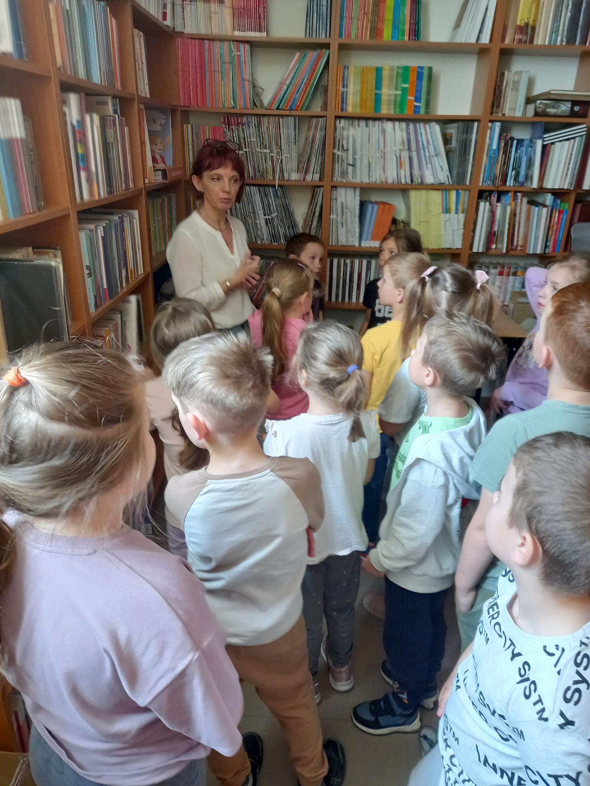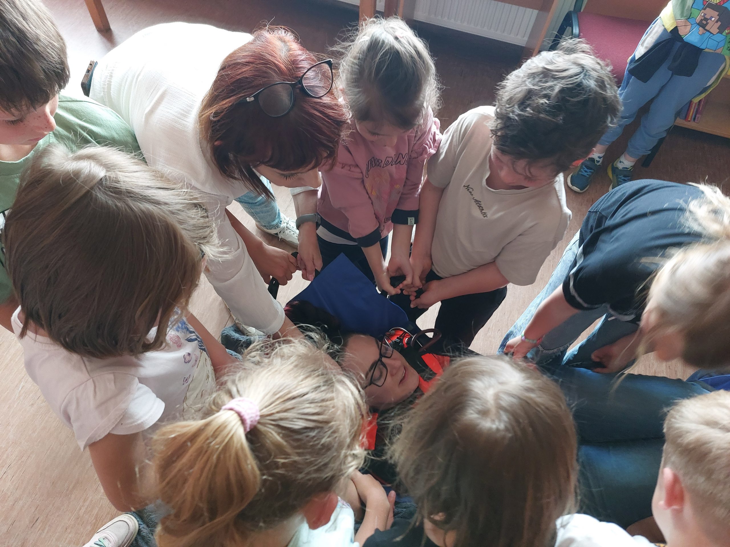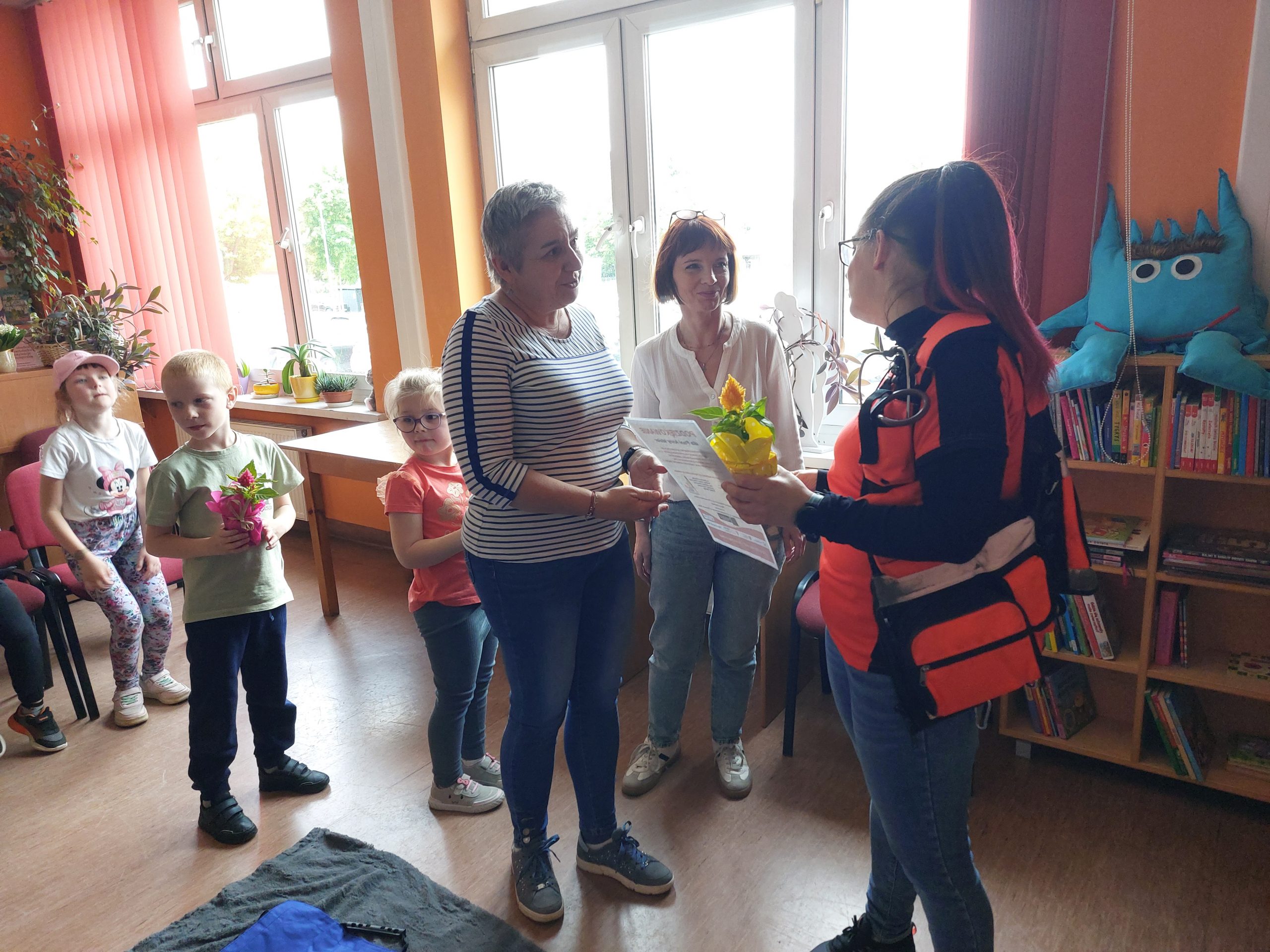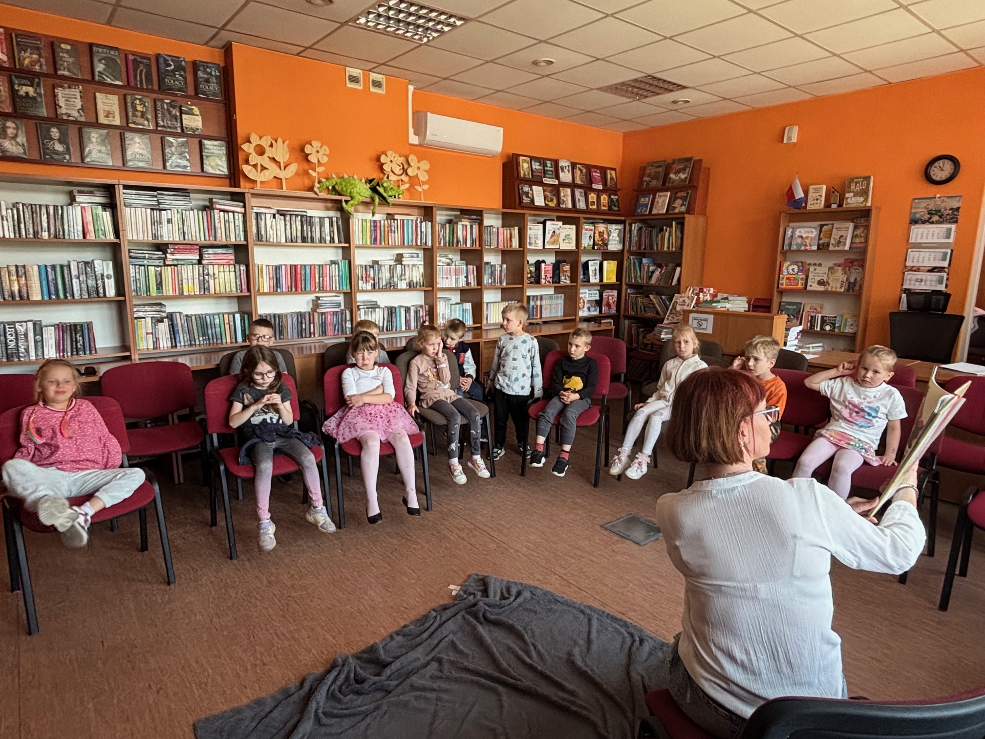 Pani Małgosia bibliotekarka wprowadziła dzieci w temat pierwszej pomocy, czytając dzieciom wyjątkową książeczkę pt. „Łukasz ratuje misia, czyli jak udzielać pierwszej pomocy”.