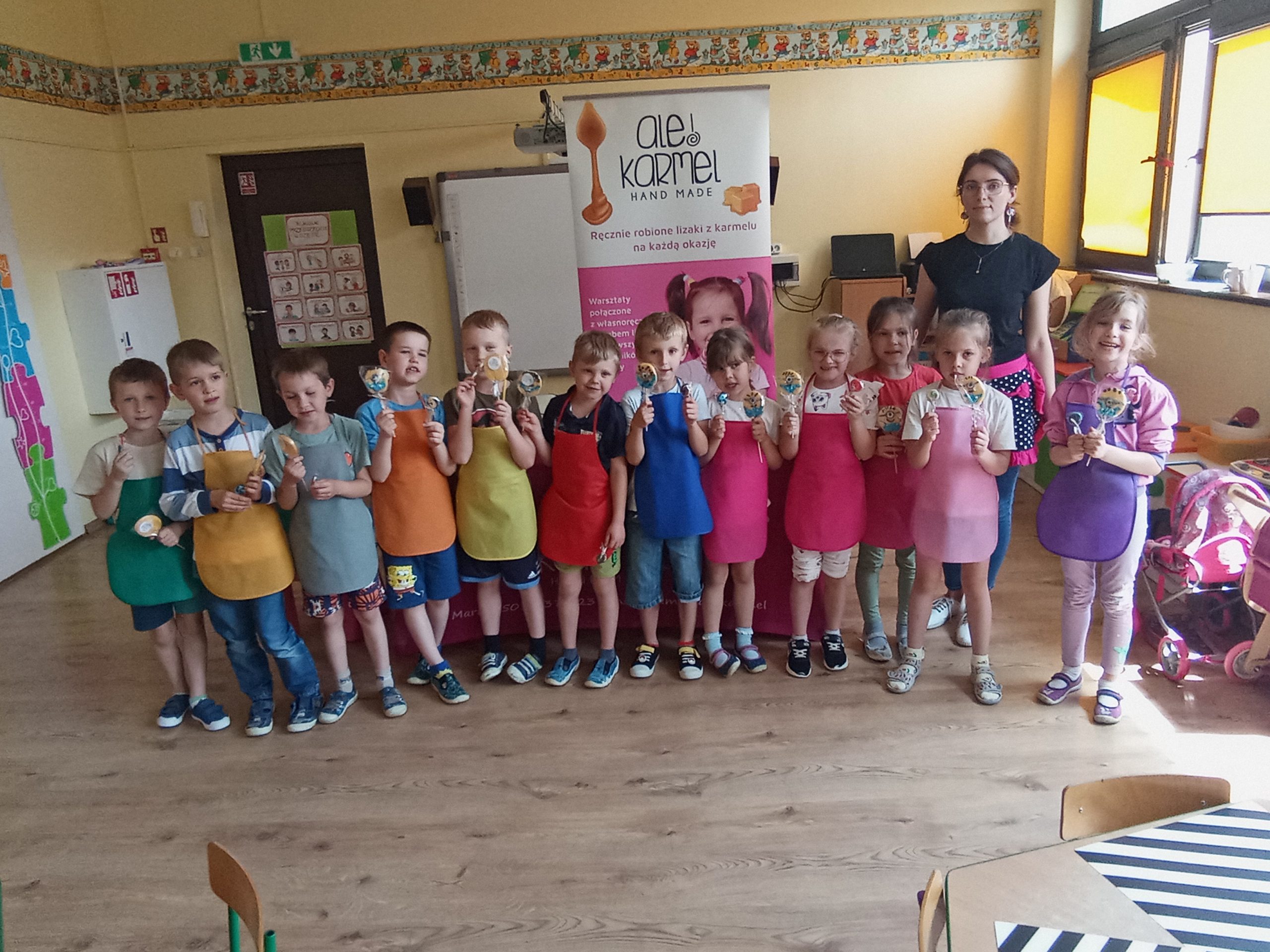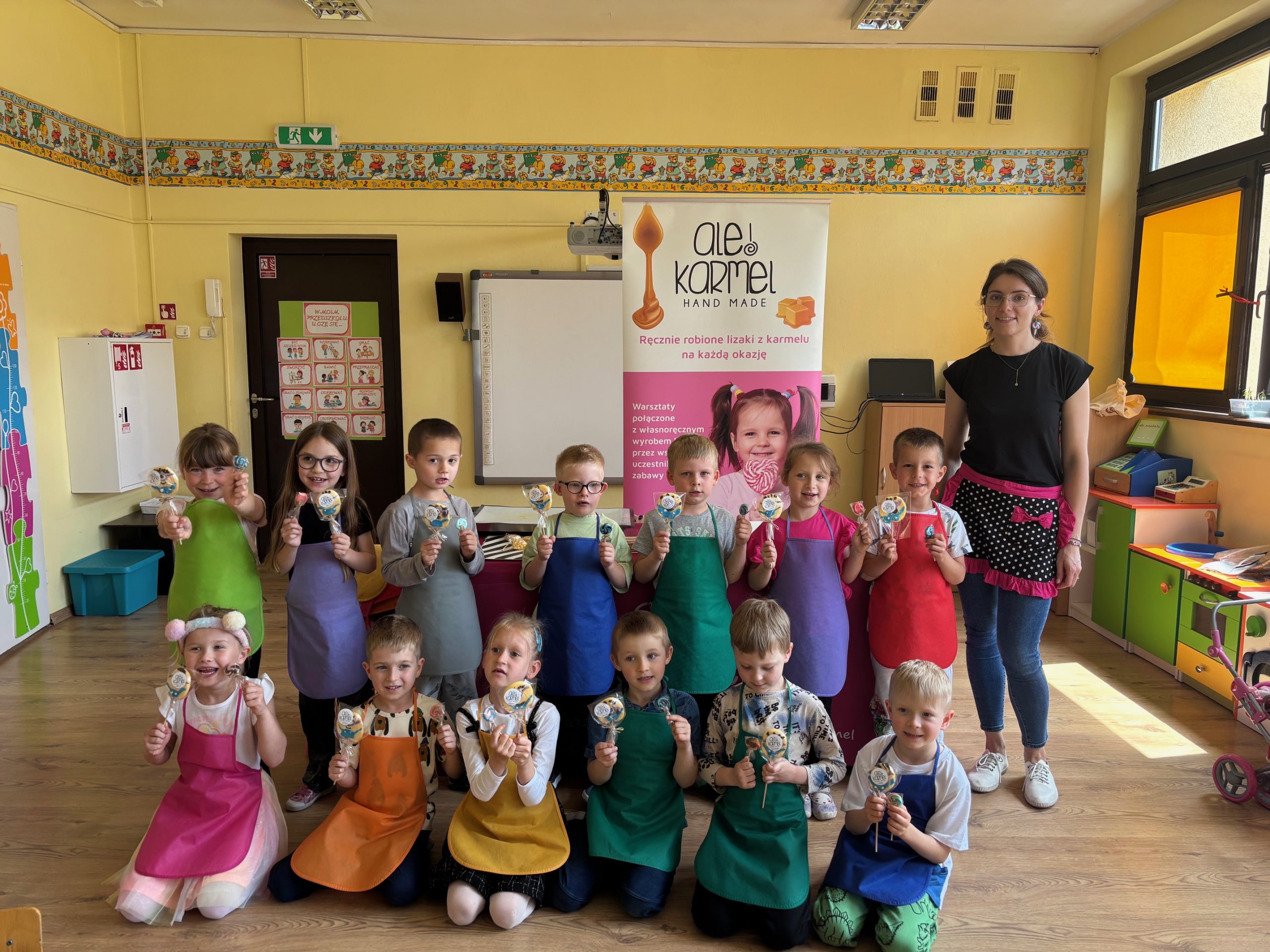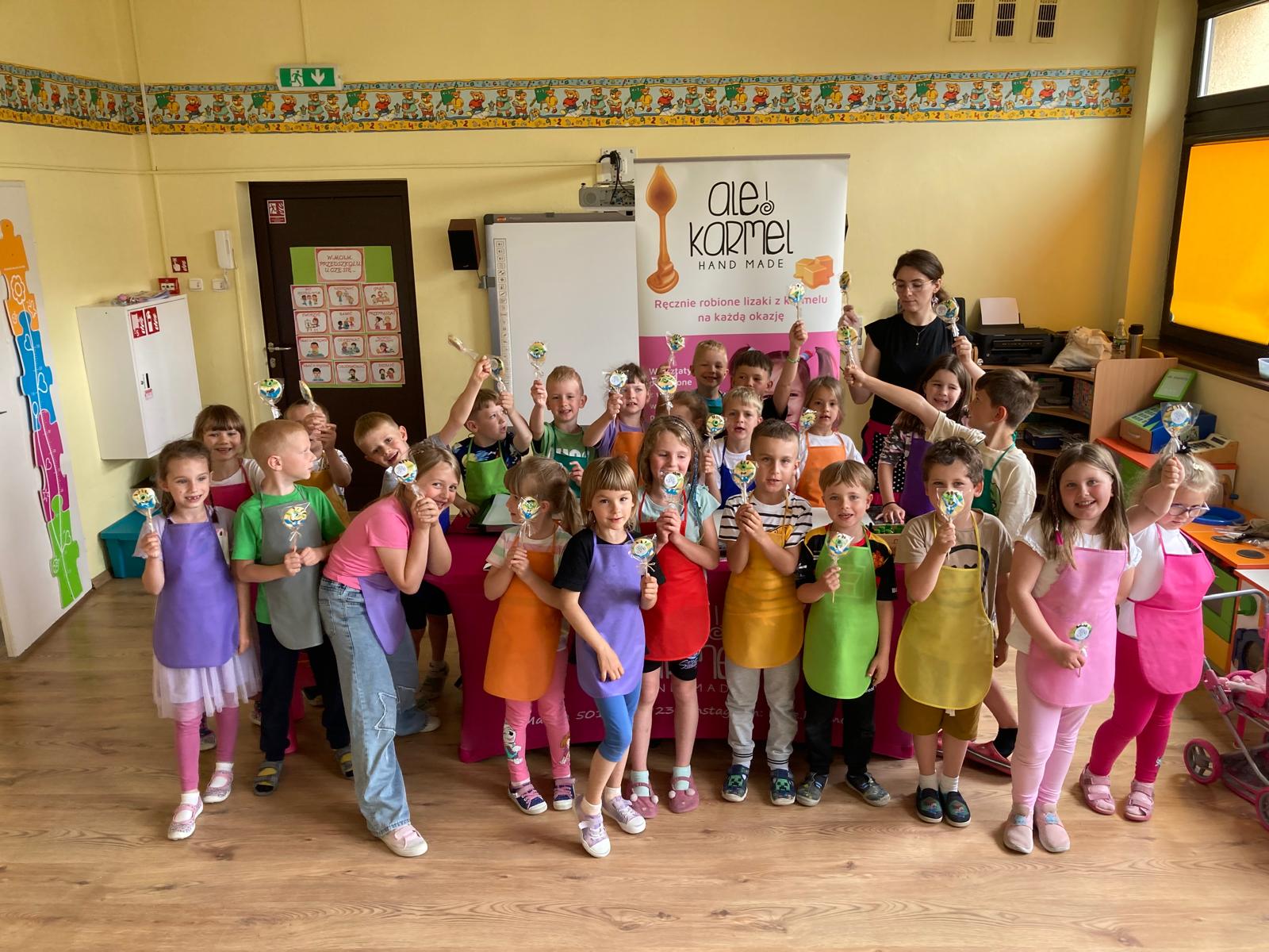 Z okazji Dnia Dziecka wszystkie przedszkolaki miały okazję uczestniczyć w niezwykłych warsztatach. Były to warsztaty robienia lizaków z firmą „Ale Karmel” oraz magiczno – chemiczne zabawy z Akademią Eksperymentów.