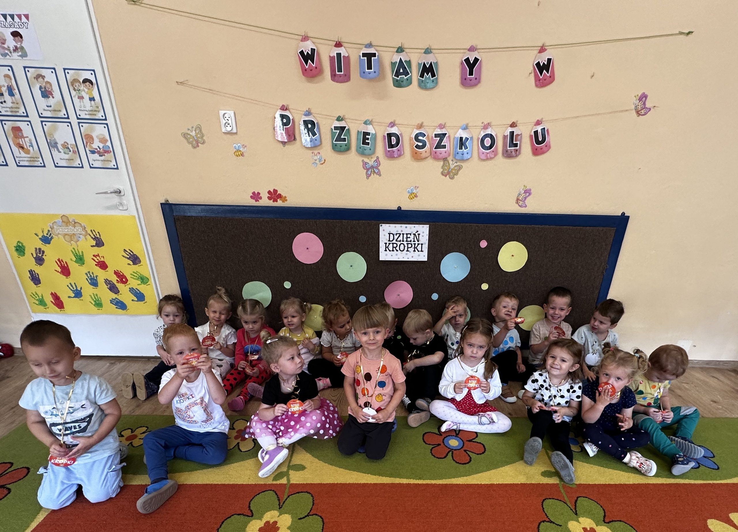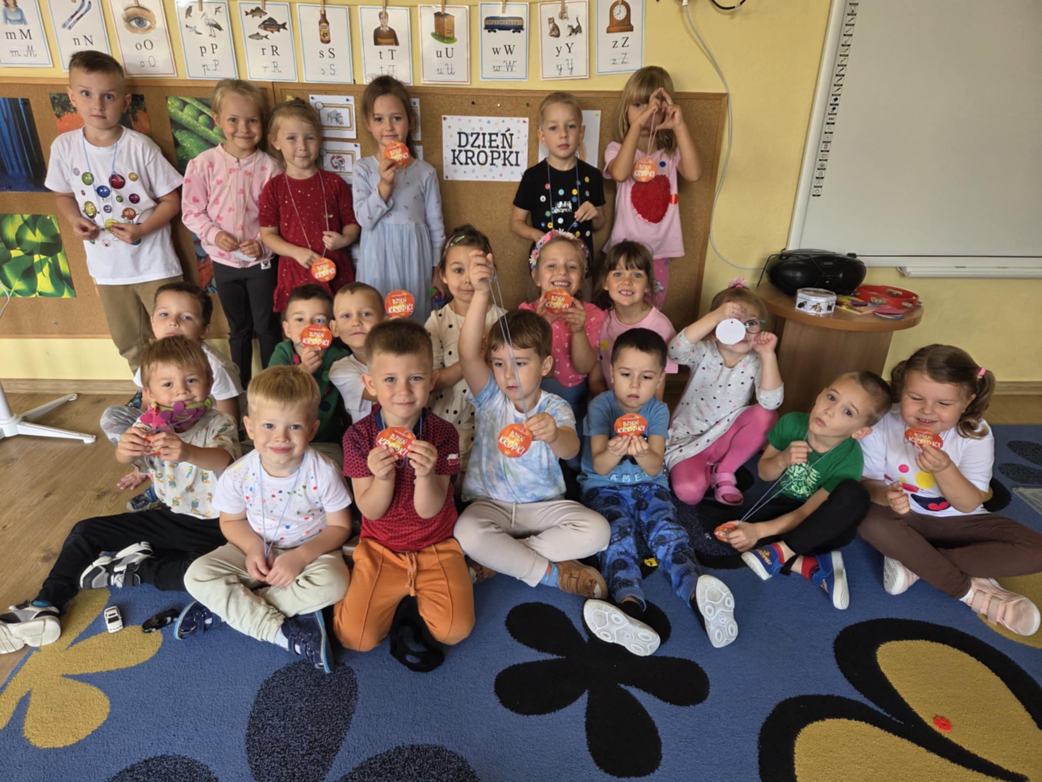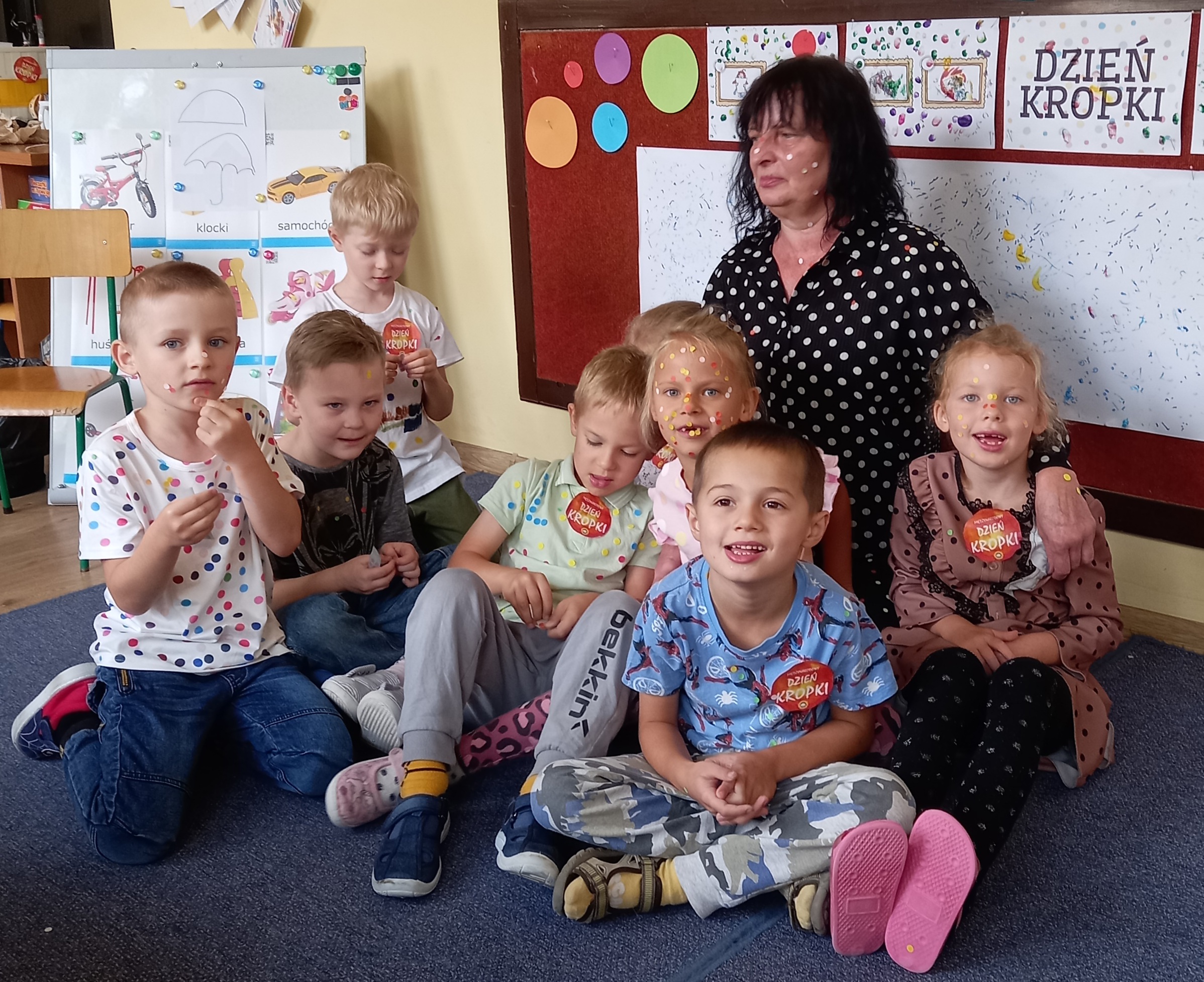 15 września w naszym przedszkolu wszystkie grupy świętowały Międzynarodowy Dzień Kropki – święto kreatywności, odwagi i wiary we własne możliwości. Tego dnia przedszkolaki przyszły ubrane w stroje ozdobione kolorowymi kropkami, a całe przedszkole wyglądało wyjątkowo radośnie i barwnie.Dzieci obejrzały film o małej Vashti – dziewczynce, która dzięki jednej małej kropce odkryła swój talent i odwagę, by tworzyć. Następnie każda grupa uczestniczyła w różnorodnych zabawach plastycznych, ruchowych i muzycznych inspirowanych motywem kropki. Powstały piękne, kolorowe prace – „kropkowe obrazy”, które ozdobiły nasze sale.Dzień Kropki był wspaniałą okazją do rozwijania dziecięcej wyobraźni, kreatywności oraz wzmacniania wiary we własne możliwości. Wspólna zabawa przyniosła wszystkim mnóstwo radości i uśmiechu!