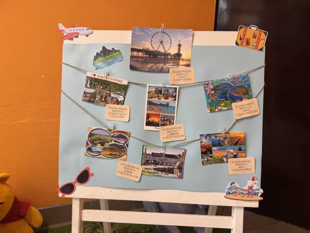 W okresie wakacyjnym w naszym przedszkolu została zorganizowana akcja pt. „Kartka z wakacji”, skierowana do dzieci i ich rodziców. Celem inicjatywy było zachęcenie przedszkolaków do dzielenia się swoimi wakacyjnymi wspomnieniami poprzez wysyłanie pocztówek z miejsc, które odwiedzili – zarówno w Polsce, jak i za granicą.