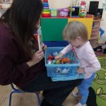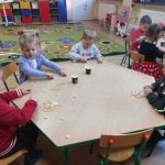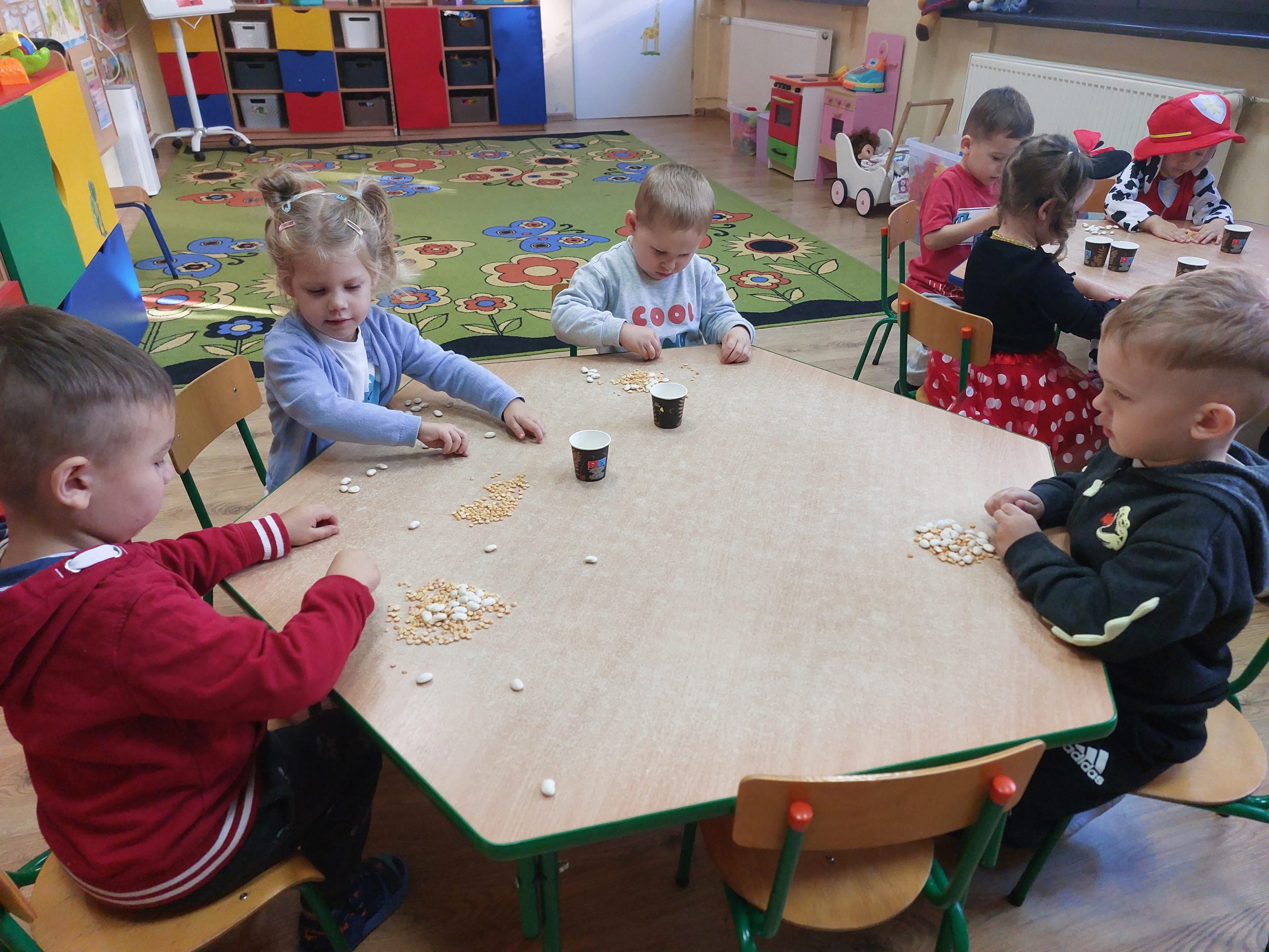 Potem nadszedł czas na zadanie sensoryczne. Dzieci wcieliły się w rolę Kopciuszka. Musiały przebrać groch. Zadaniem naszych przedszkolaków było jak najszybsze przebranie grochu – rozdzielenie go na dwa rodzaje.