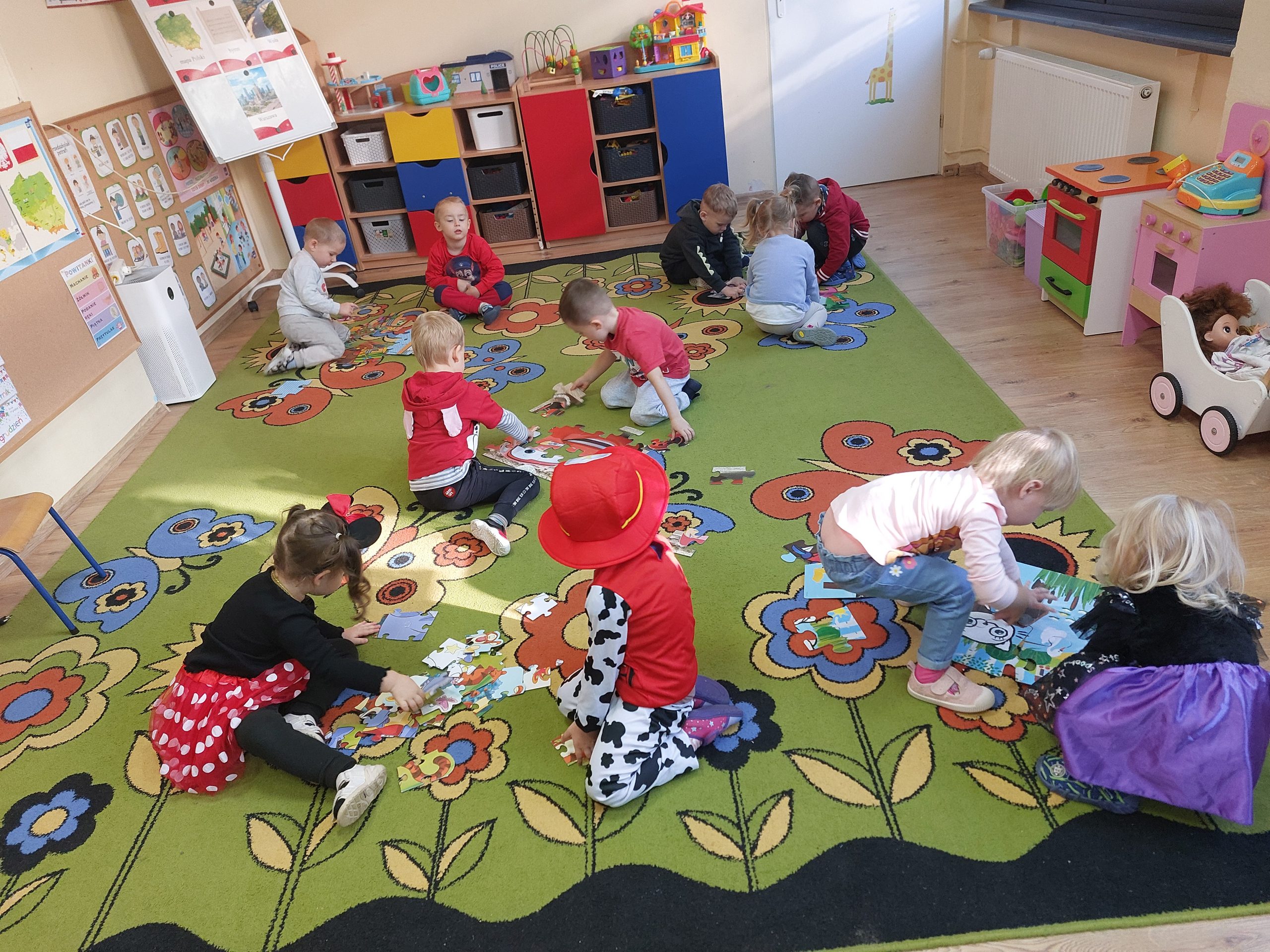 Następne zadanie opierało się na współpracy grupowej. Zadaniem grup było jak najszybsze ułożenie bajkowych puzzli i podanie poprawnego tytułu bajki.