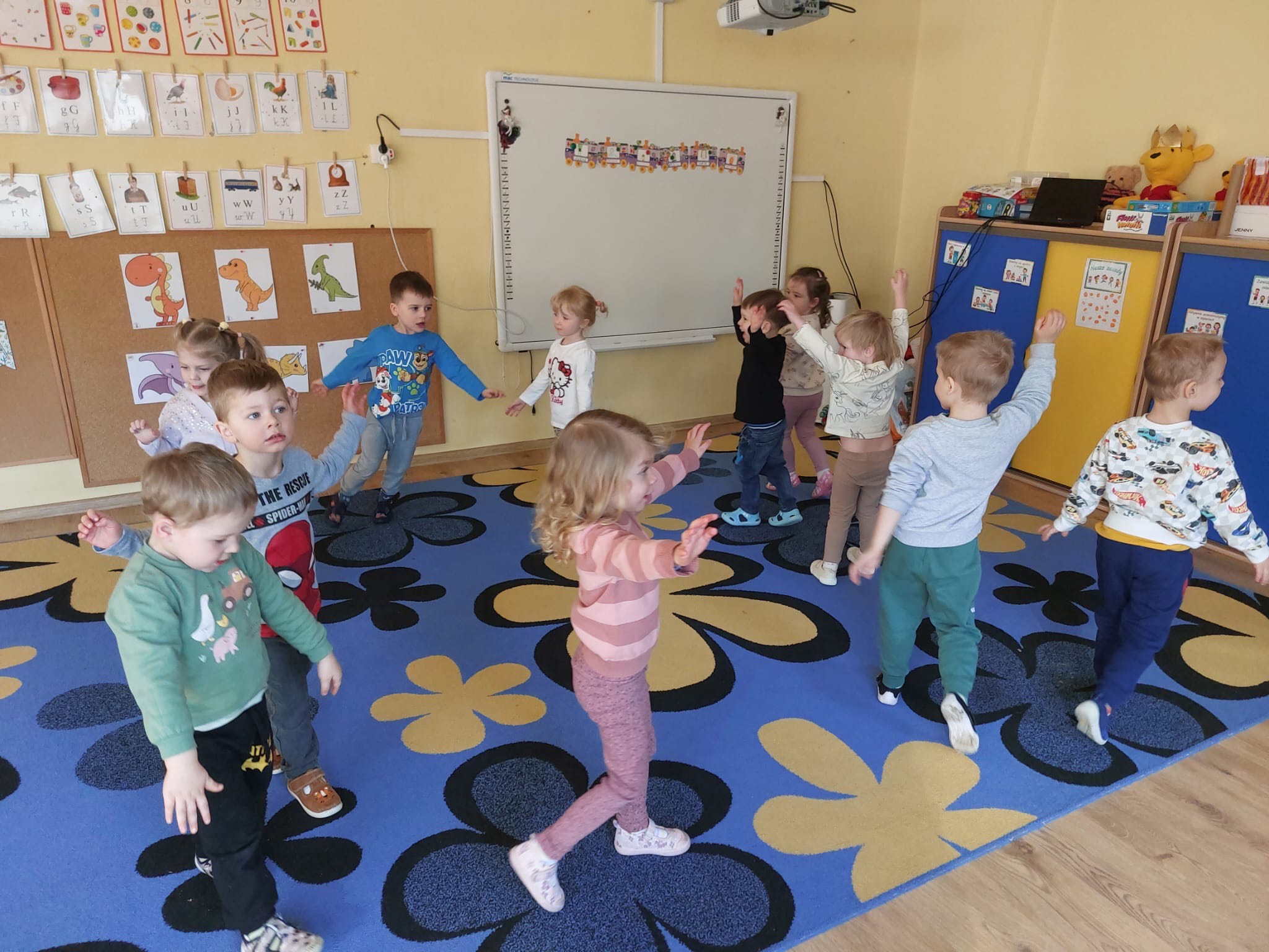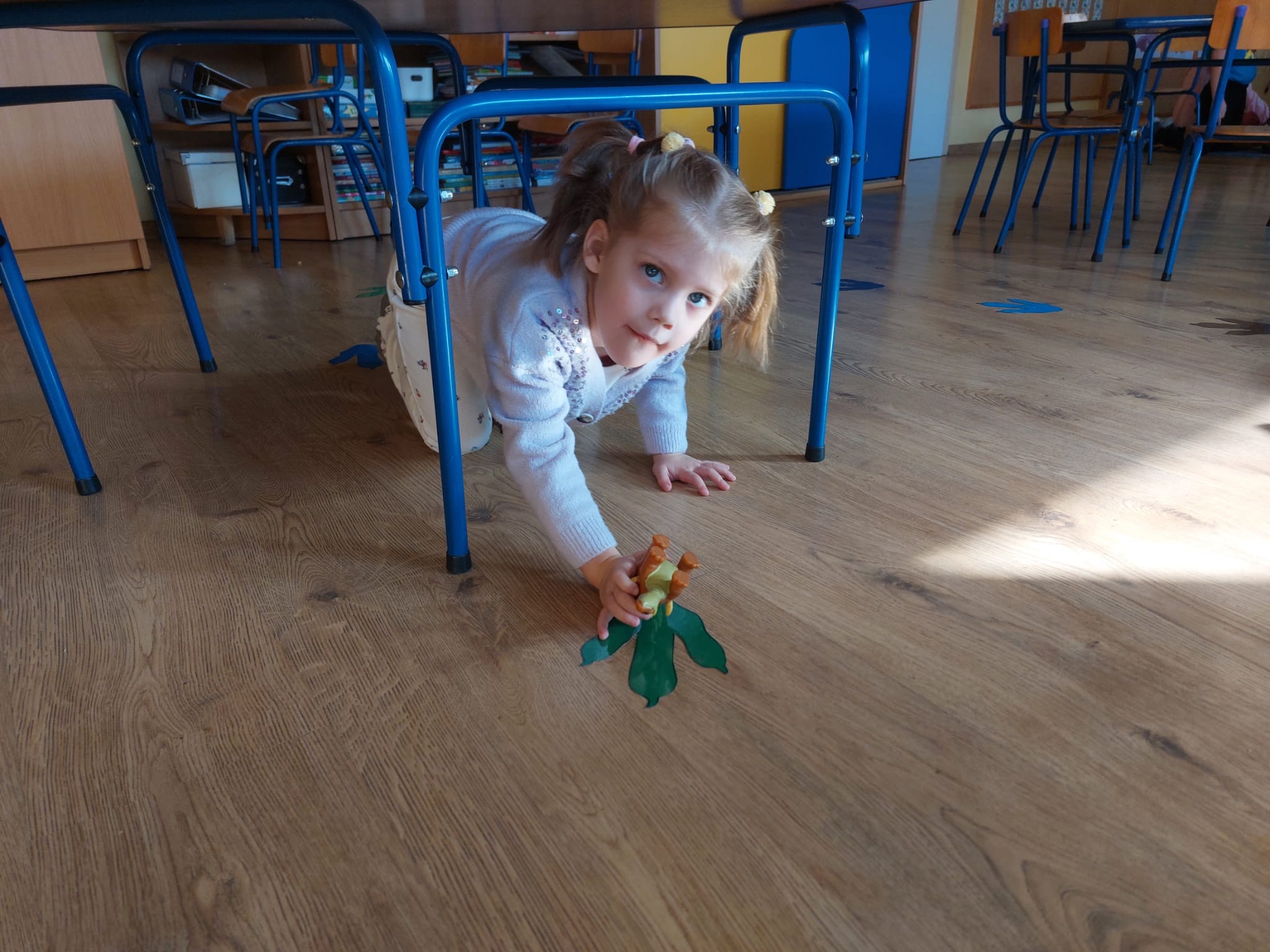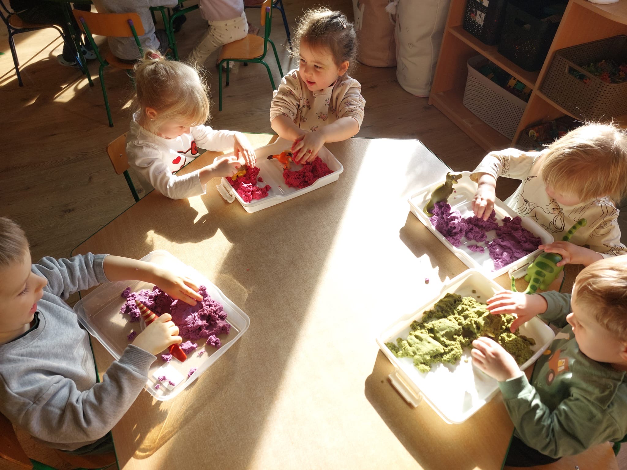 Szczególne zainteresowanie wzbudziły zadania matematyczne — przedszkolaki z entuzjazmem przeliczały dinozaury oraz grupowały je w zbiory, wykazując dużą ciekawość i spostrzegawczość. Nie zabrakło również ruchu: podczas gimnastyki dzieci wykonywały podskoki inspirowane dinozaurami, co wywołało wiele śmiechu i energii.