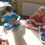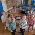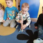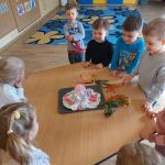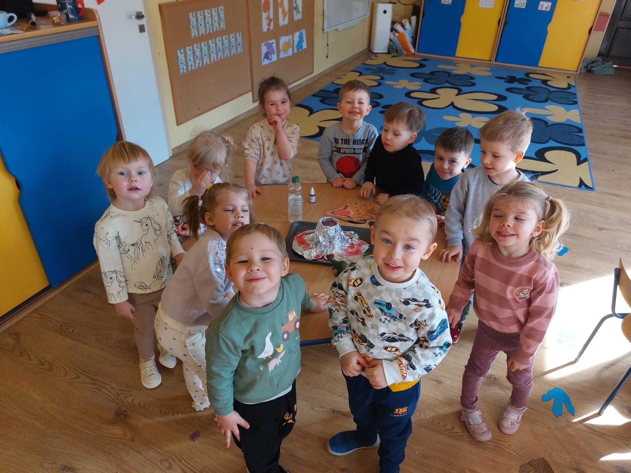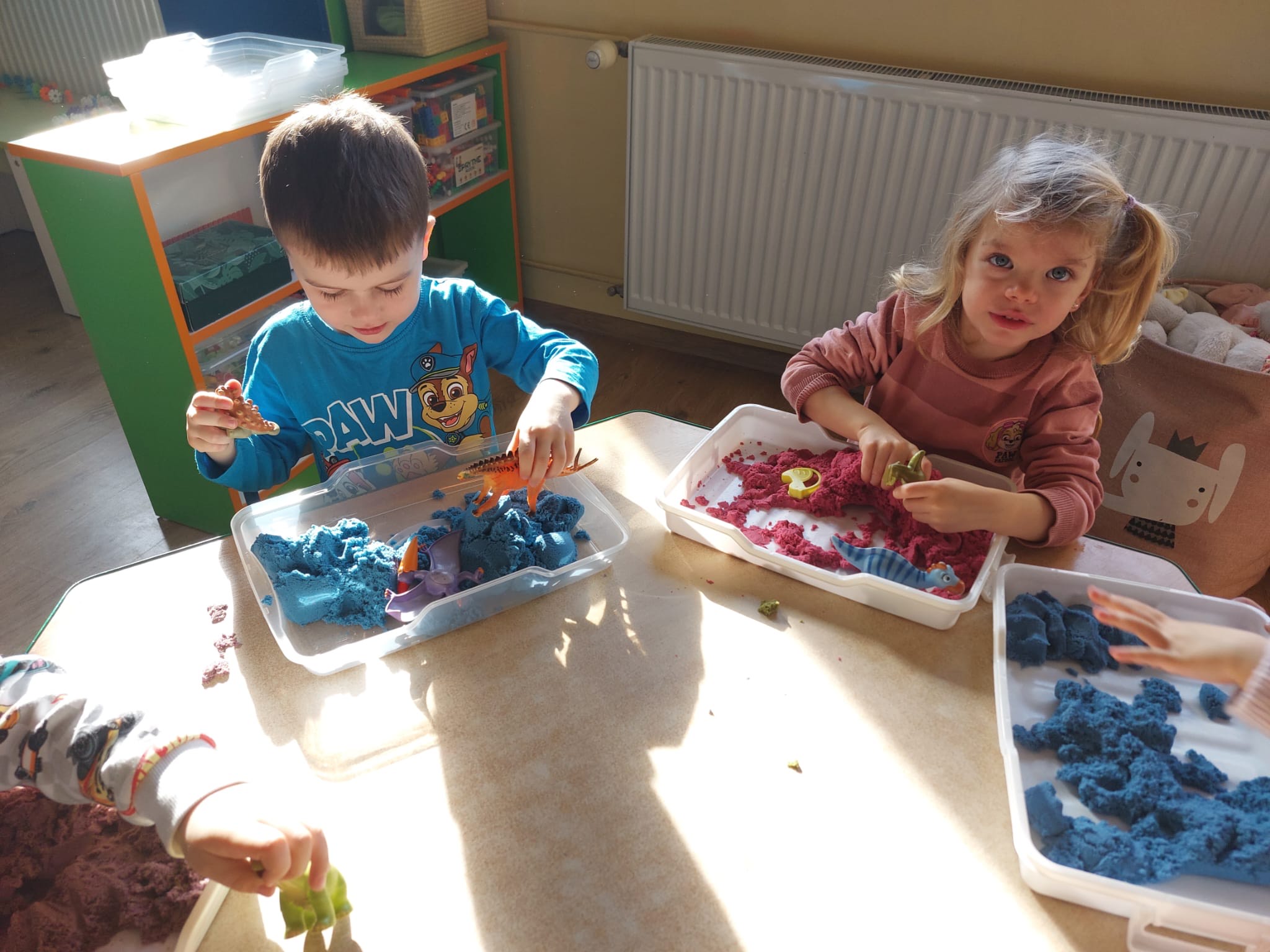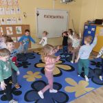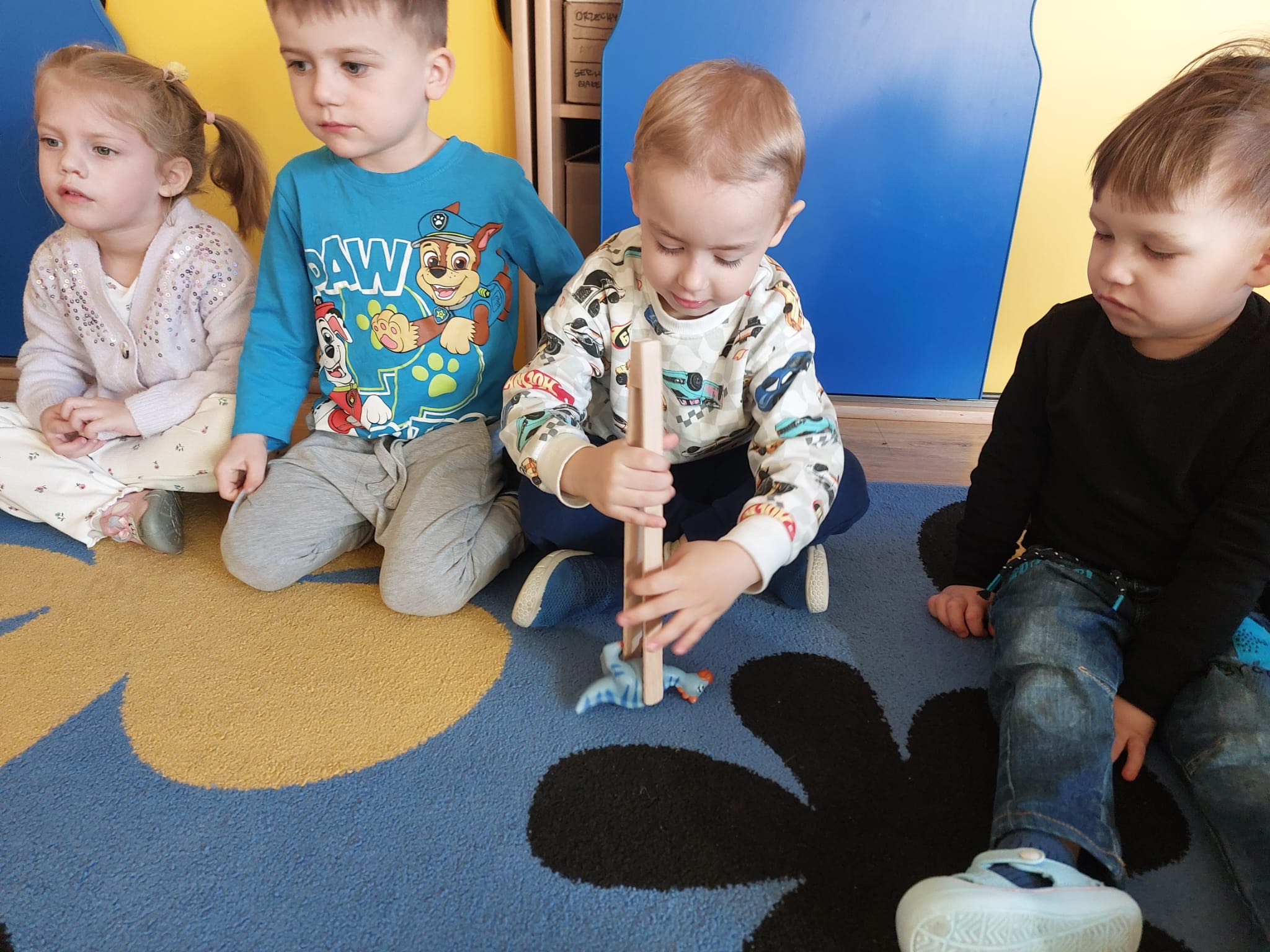 Szczególne zainteresowanie wzbudziły zadania matematyczne — przedszkolaki z entuzjazmem przeliczały dinozaury oraz grupowały je w zbiory, wykazując dużą ciekawość i spostrzegawczość. Nie zabrakło również ruchu: podczas gimnastyki dzieci wykonywały podskoki inspirowane dinozaurami, co wywołało wiele śmiechu i energii.