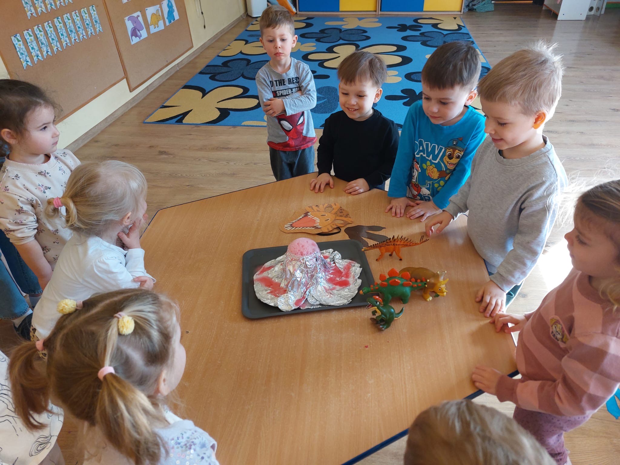 Dużą atrakcją okazał się także eksperyment „wybuchającego wulkanu” z octu i sody. Dzieci z zaciekawieniem obserwowały reakcję i z radością komentowały efektowny „wybuch”.