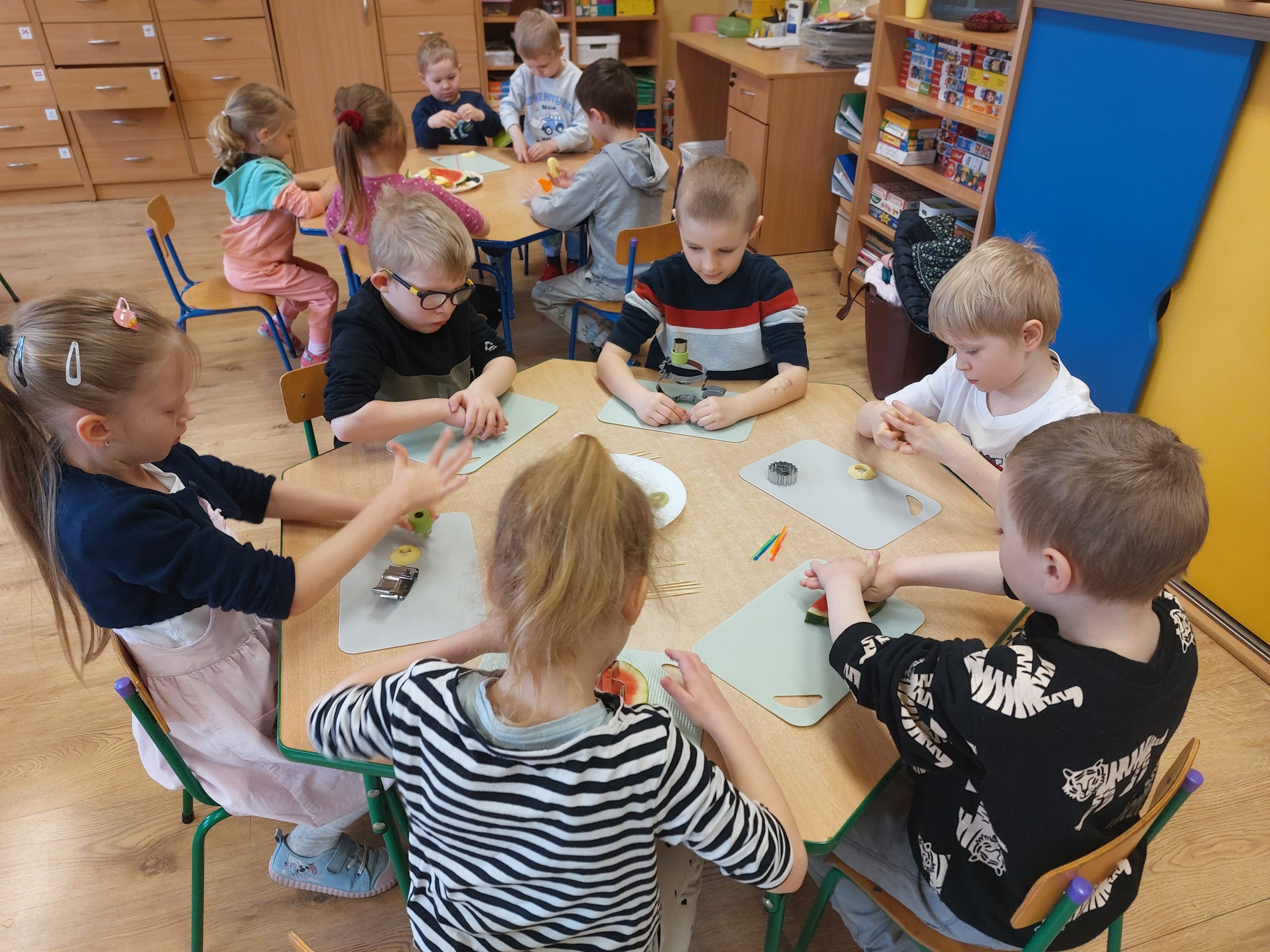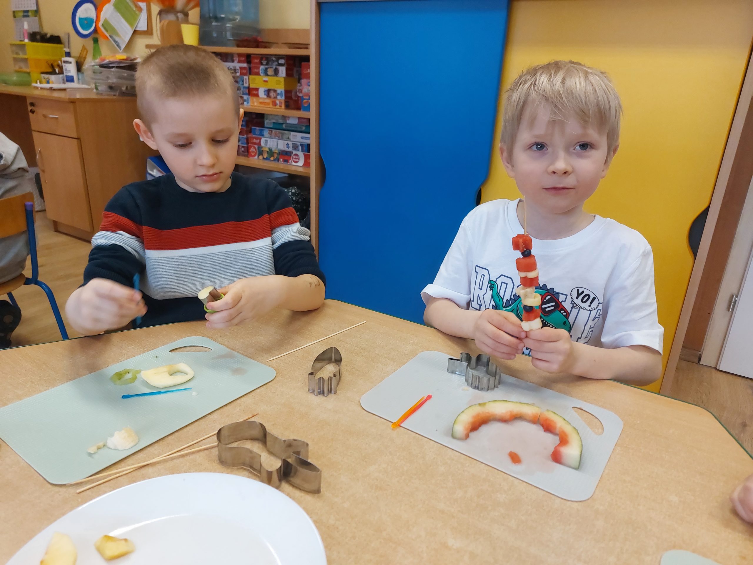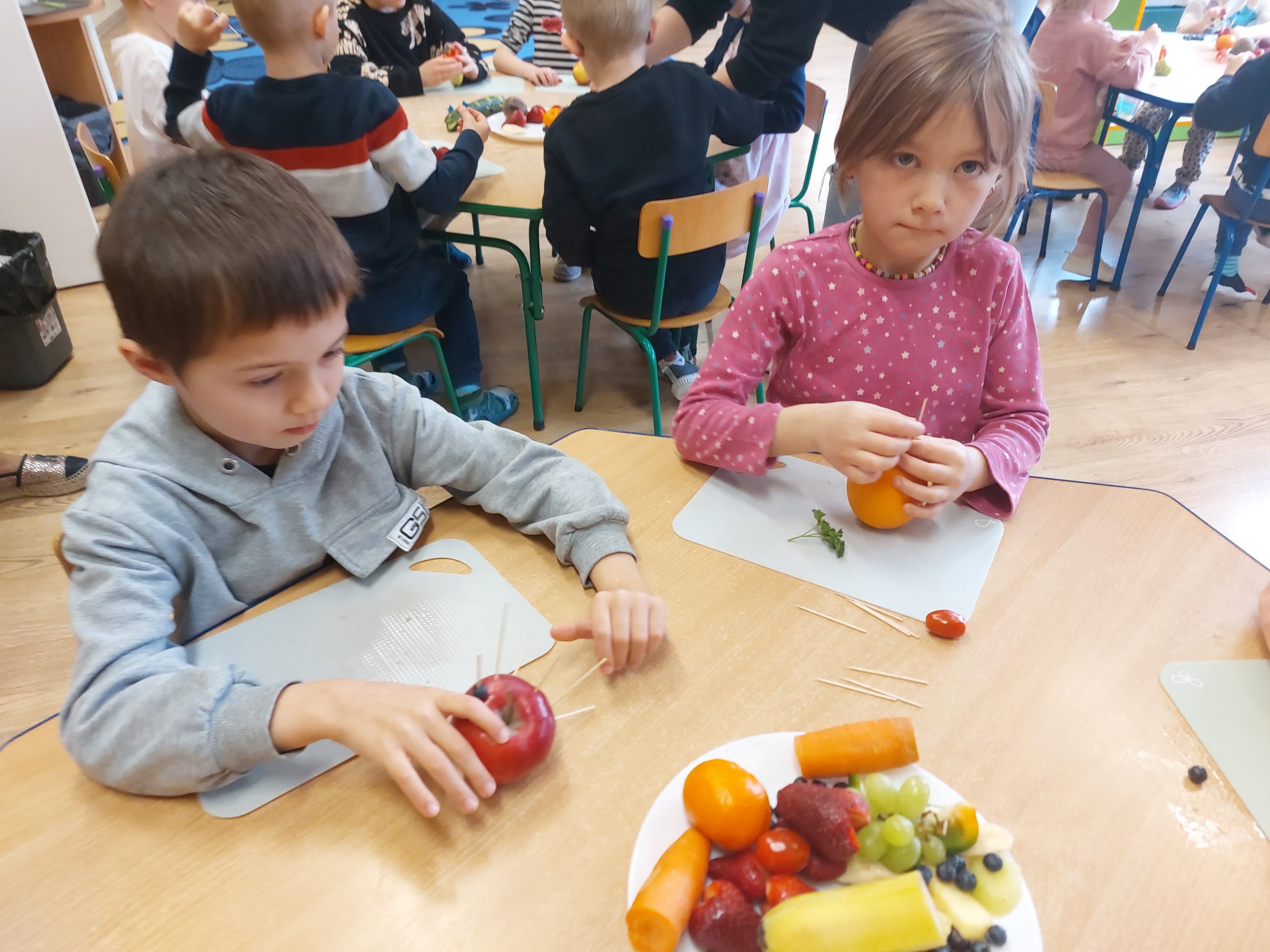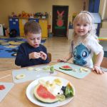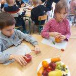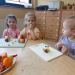 Dzieci wykrawały kształty z owoców, wykonywały „stworki – potworki” z owoców i warzyw z użyciem patyczków, a później przyrządziły kolorowe i smakowite owocowe koktajle. Dzieci chętnie uczestniczyły w zajęciach kulinarnych.