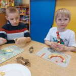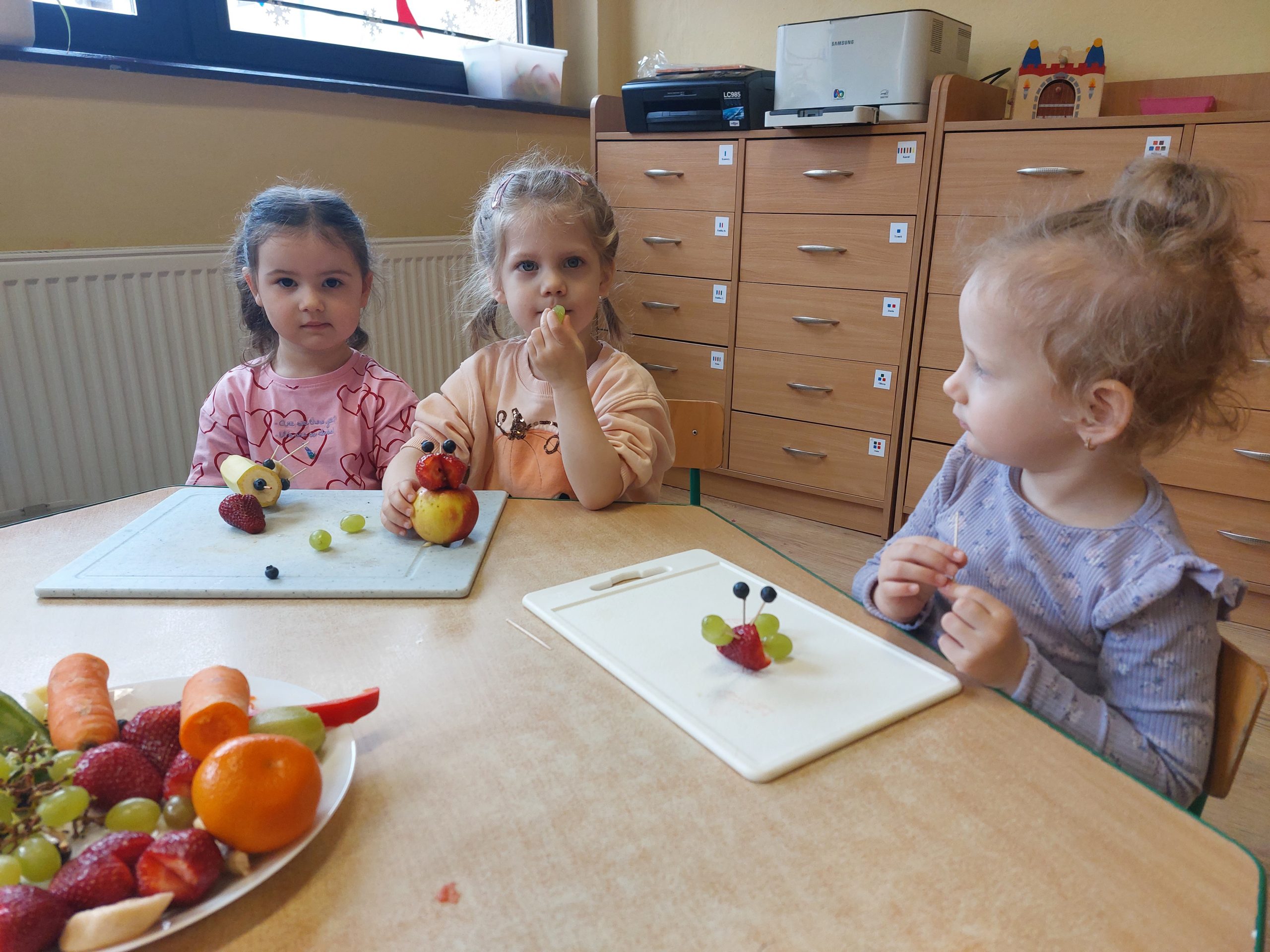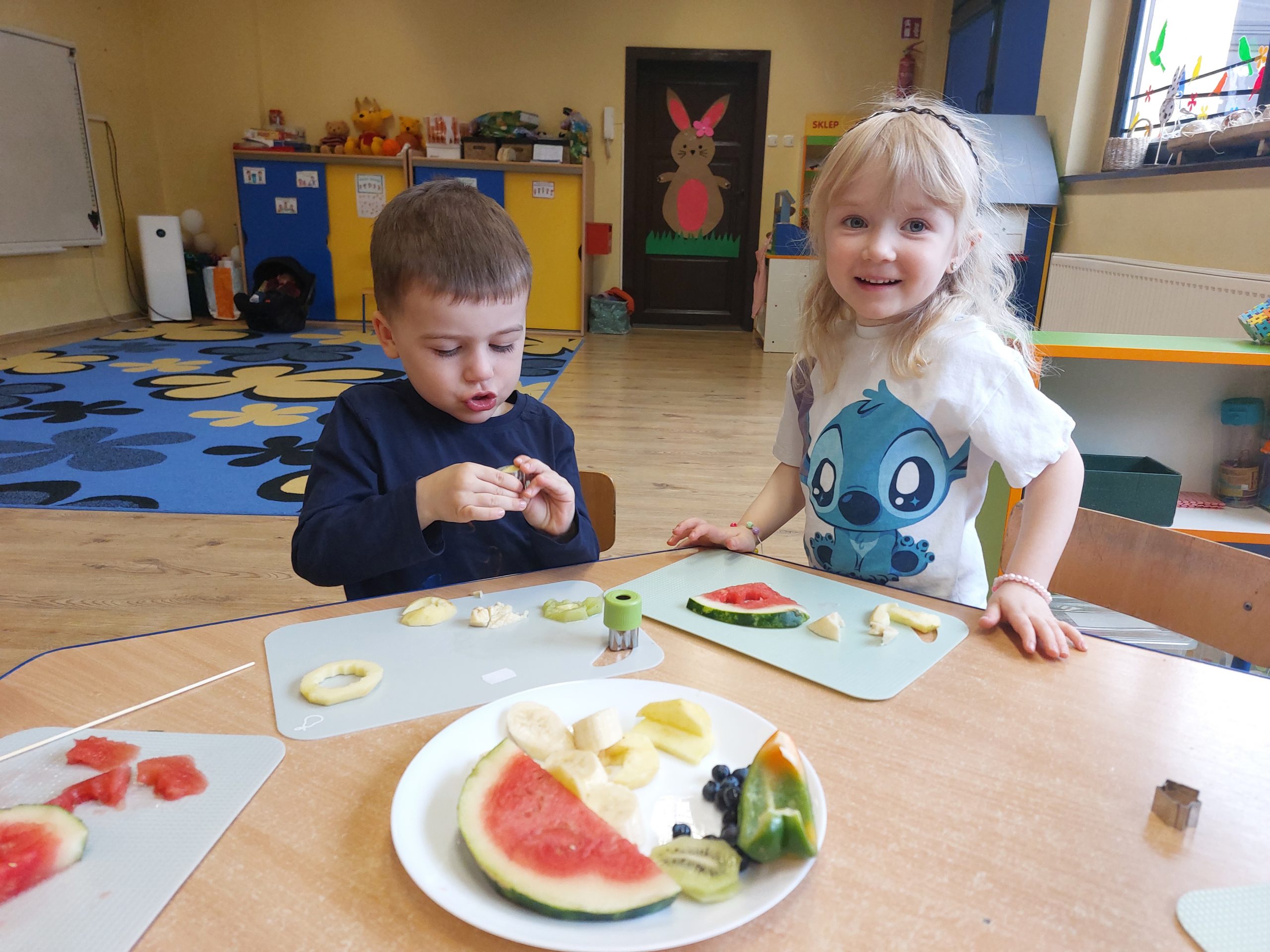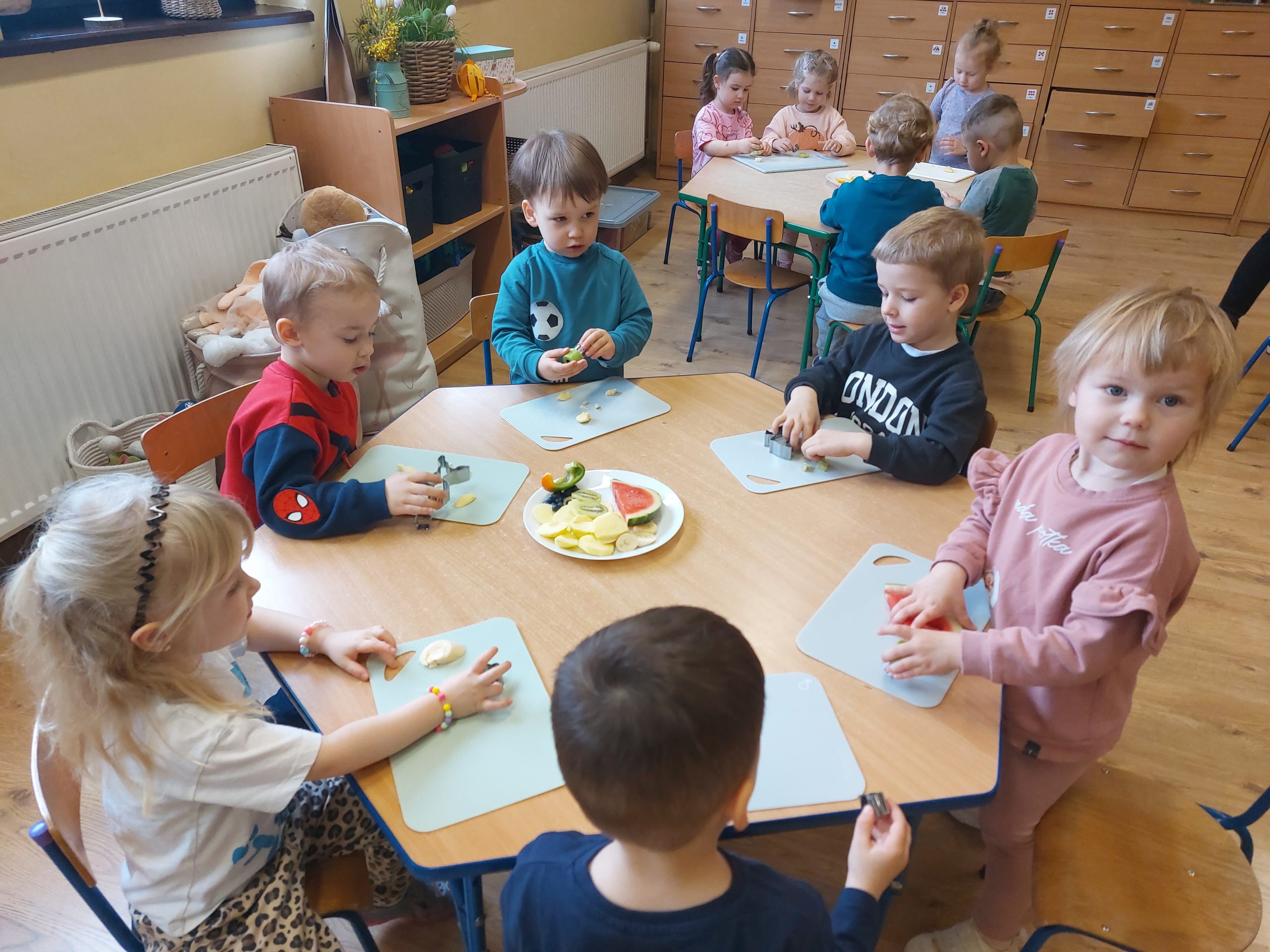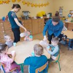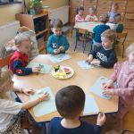 Dzieci wykrawały kształty z owoców, wykonywały „stworki – potworki” z owoców i warzyw z użyciem patyczków, a później przyrządziły kolorowe i smakowite owocowe koktajle. Dzieci chętnie uczestniczyły w zajęciach kulinarnych.